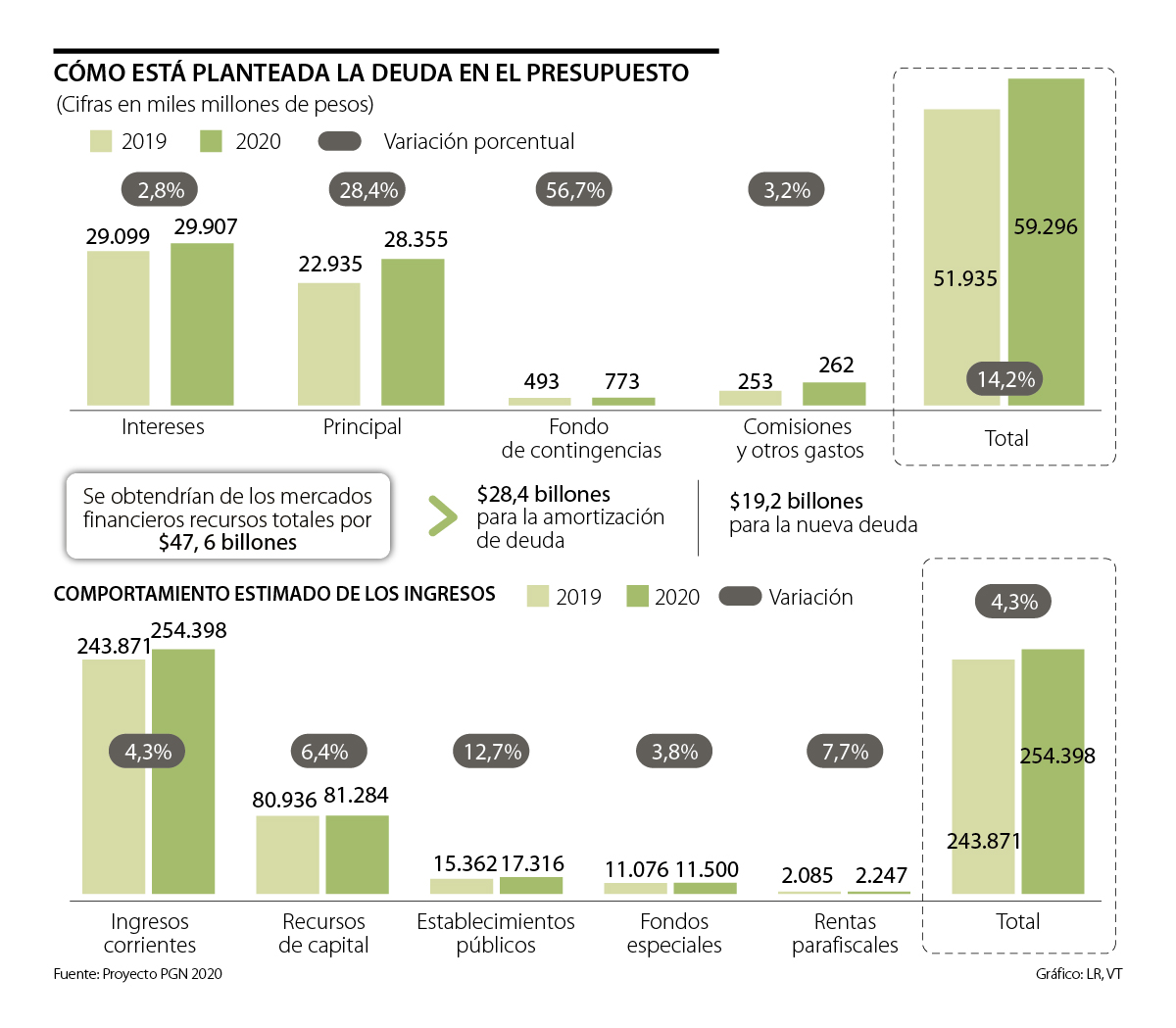 El Gobierno no solo planea aplazar el pago de su deuda para garantizar los recursos del Presupuesto General de la Nación para la vigencia de 2020, sino que también contempla contratar un nuevo endeudamiento que estaría por el orden de $19,2 billones. En total, se tiene previsto que de los mercados financieros se obtendrán $47,6 billones.