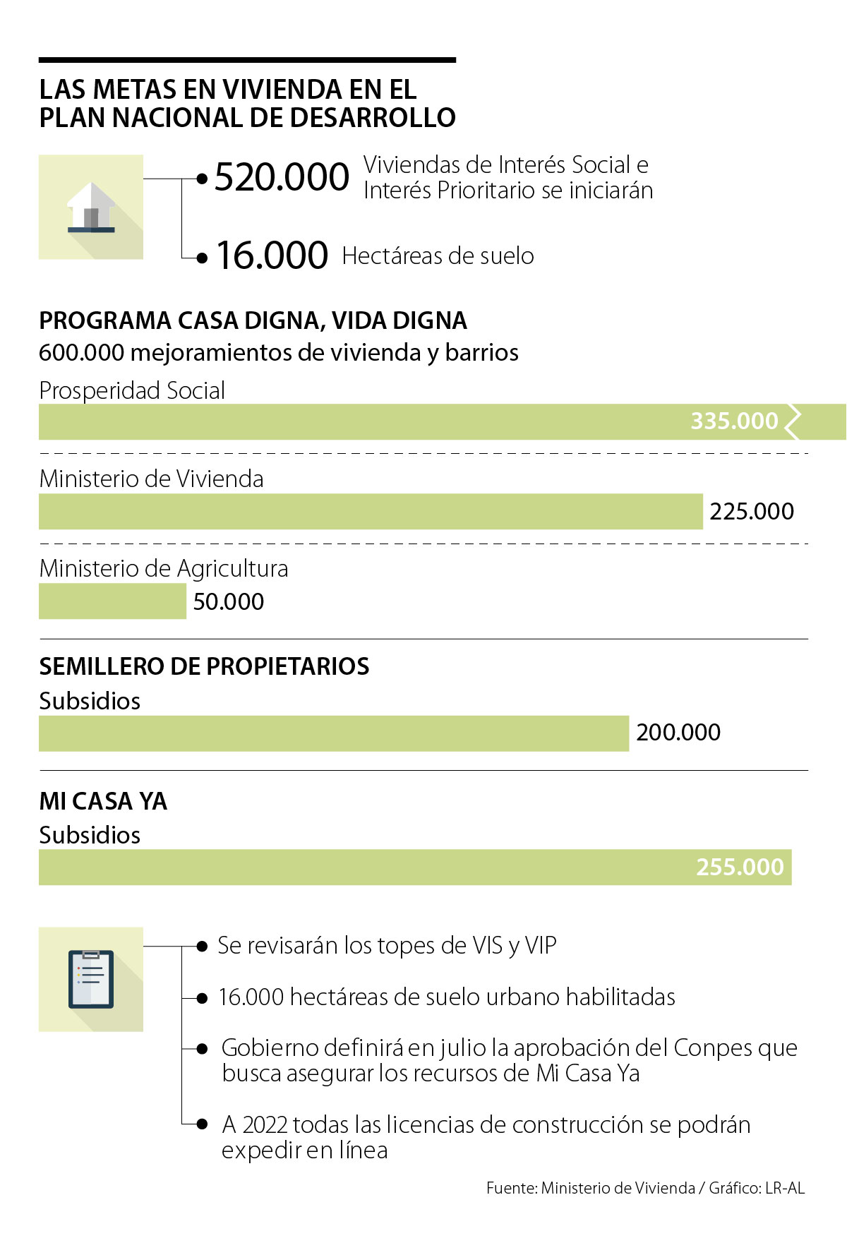 Las metas del Gobierno Nacional para el próximo cuatrienio se centran en tres principales ejes: mejorar un poco más de 600.000 viviendas bajo el programa Casa Digna, Vida Digna; iniciar 520.000 residencias VIP y VIS con Mi Casa Ya y Semillero de Propietarios; y habilitar hasta 16.000 hectáreas de suelo urbano para su construcción. La razón: ampliar la cobertura de los programas y el mayor acceso a la compra de vivienda.