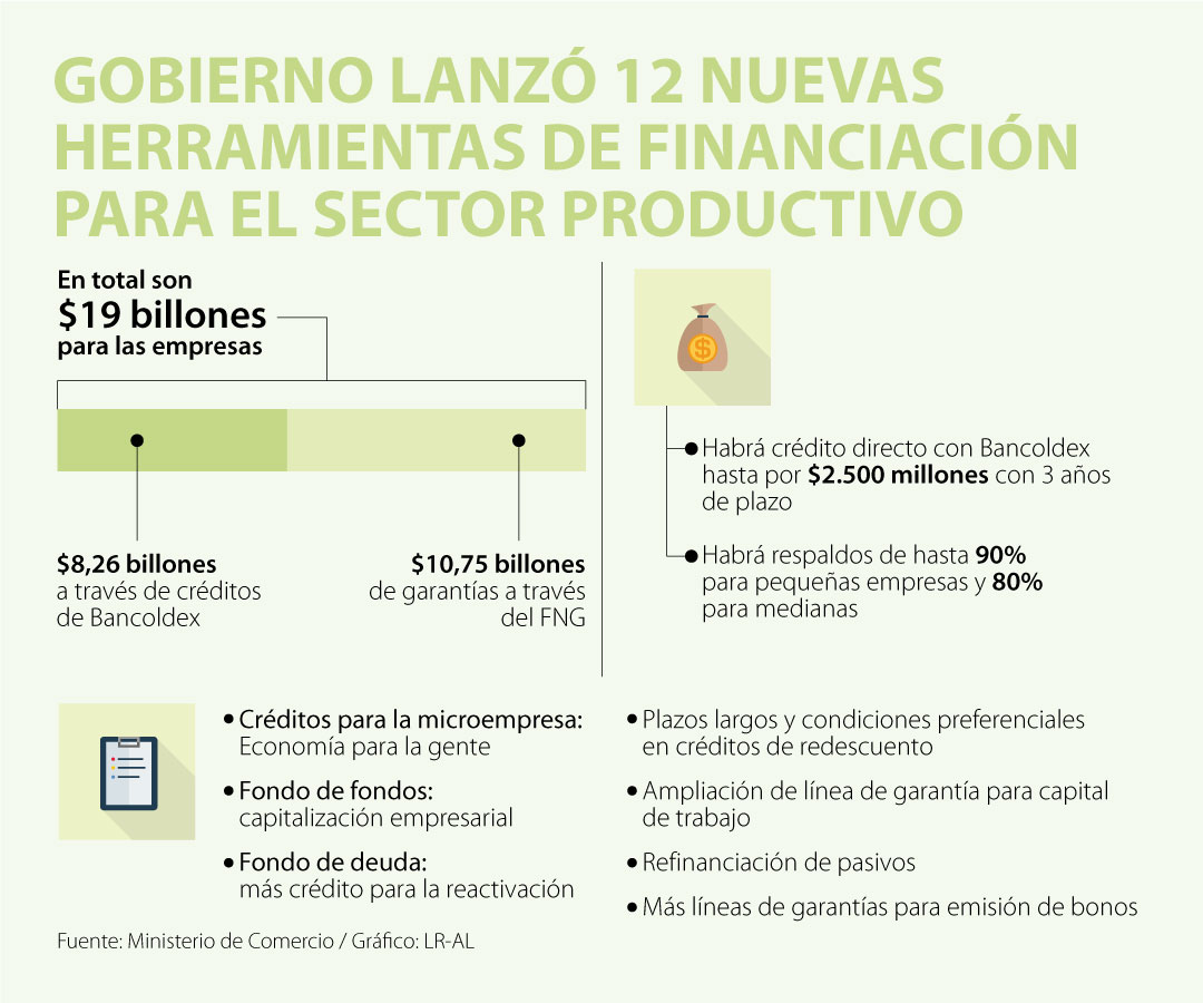 Estas 12 herramientas habilitan recursos para las empresas hasta por $19 billones tanto en créditos como en garantías para los productos. Serán $8,26 billones a través de instrumentos de Bancóldex y respaldo para $10,75 billones con instrumentos del Fondo Nacional de Garantías (FNG).