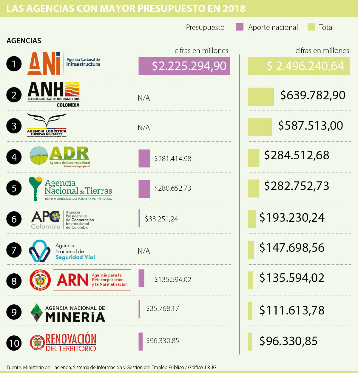 De acuerdo con el mismo documento, la ANH, la Agencia Logística de las Fuerzas Militares, la Ansv y la ANE este año no recibieron aporte nacional, sino que su presupuesto es de recursos propios. En cambio, en el caso de la Agencia para Renovación del Territorio, el total de su presupuesto para 2018 proviene de aportes de la Nación.