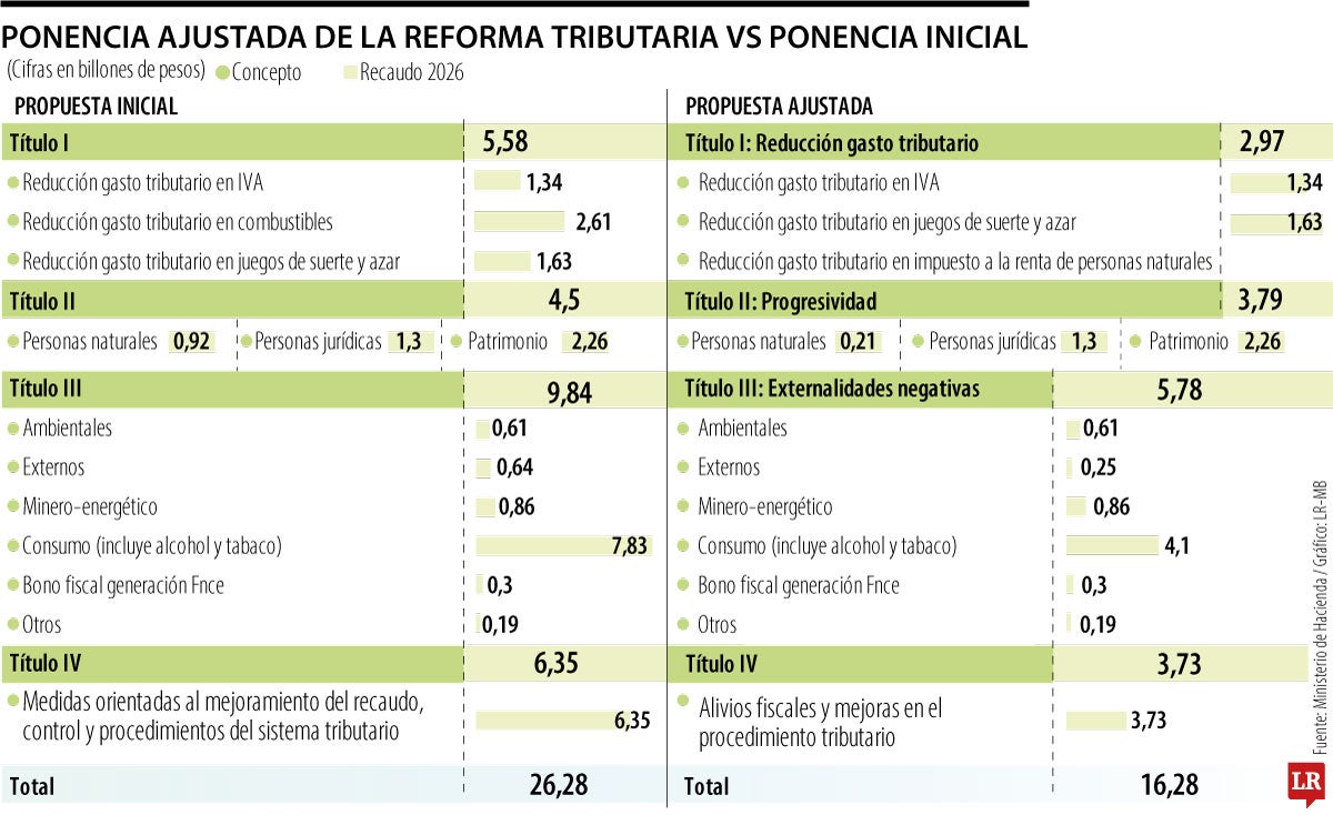 Así las cosas, del título de reducción del gasto tributario se dejarían de recaudar $2,61 billones para una nueva meta de $2,97 billones; de las medidas de renta, patrimonio y ganancias ocasionales se pasó de una meta de recaudo de $4,5 billones a $3,79 billones; de los tributos ambientales y de consumo ahora se recaudarían $5,78 billones y del título de mejoras en el procedimiento tributario ahora se recaudarían $3,73 billones de una meta inicial de $6,35 billones.