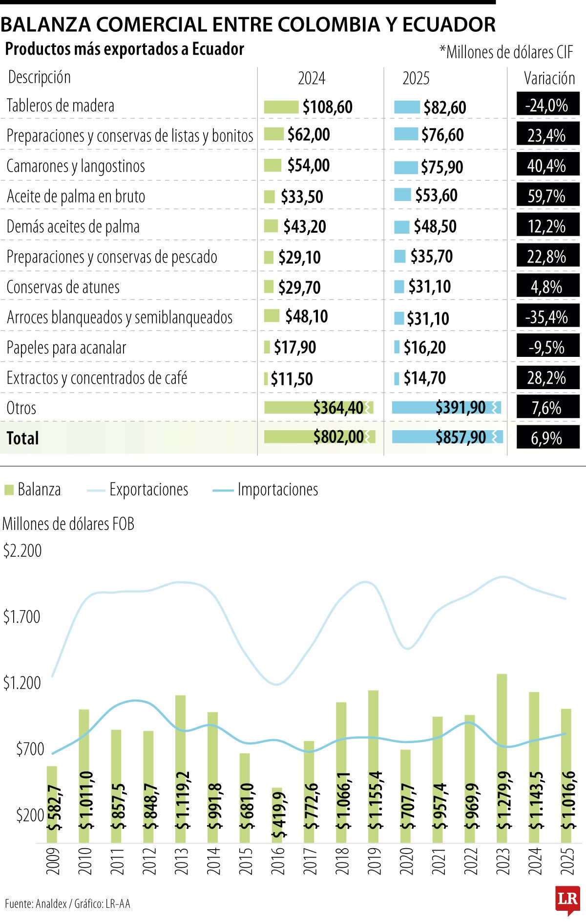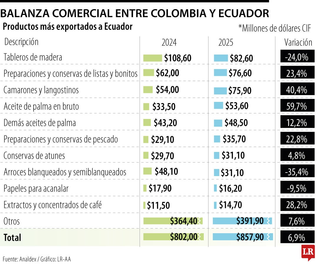 Según cifras de Analdex, el peso del incremento a 50% del arancel recaería principalmente sobre los dos productos más comprados a Ecuador: tableros de madera, los cuales movieron US$82,6 millones y representaron 9,6% de las importaciones totales; y las preparaciones y conservas, que transfirieron US$76,6 millones y aportaron 8,9%.