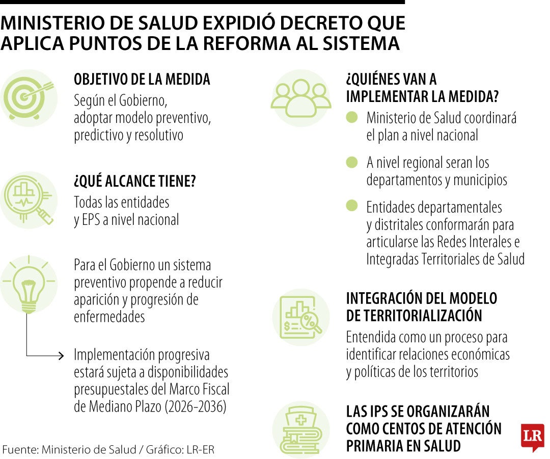 El decreto incorpora varias de las disposiciones que el Gobierno intentó avanzar a través de su reforma a la salud. En él se señala que el Ministerio de Salud será el ente rector a nivel nacional, mientras que, en el ámbito territorial, serán los departamentos, distritos y municipios quienes asumirán el liderazgo. De esta forma, serán las entidades públicas las encargadas de definir las directrices de implementación y ejecución del sistema.