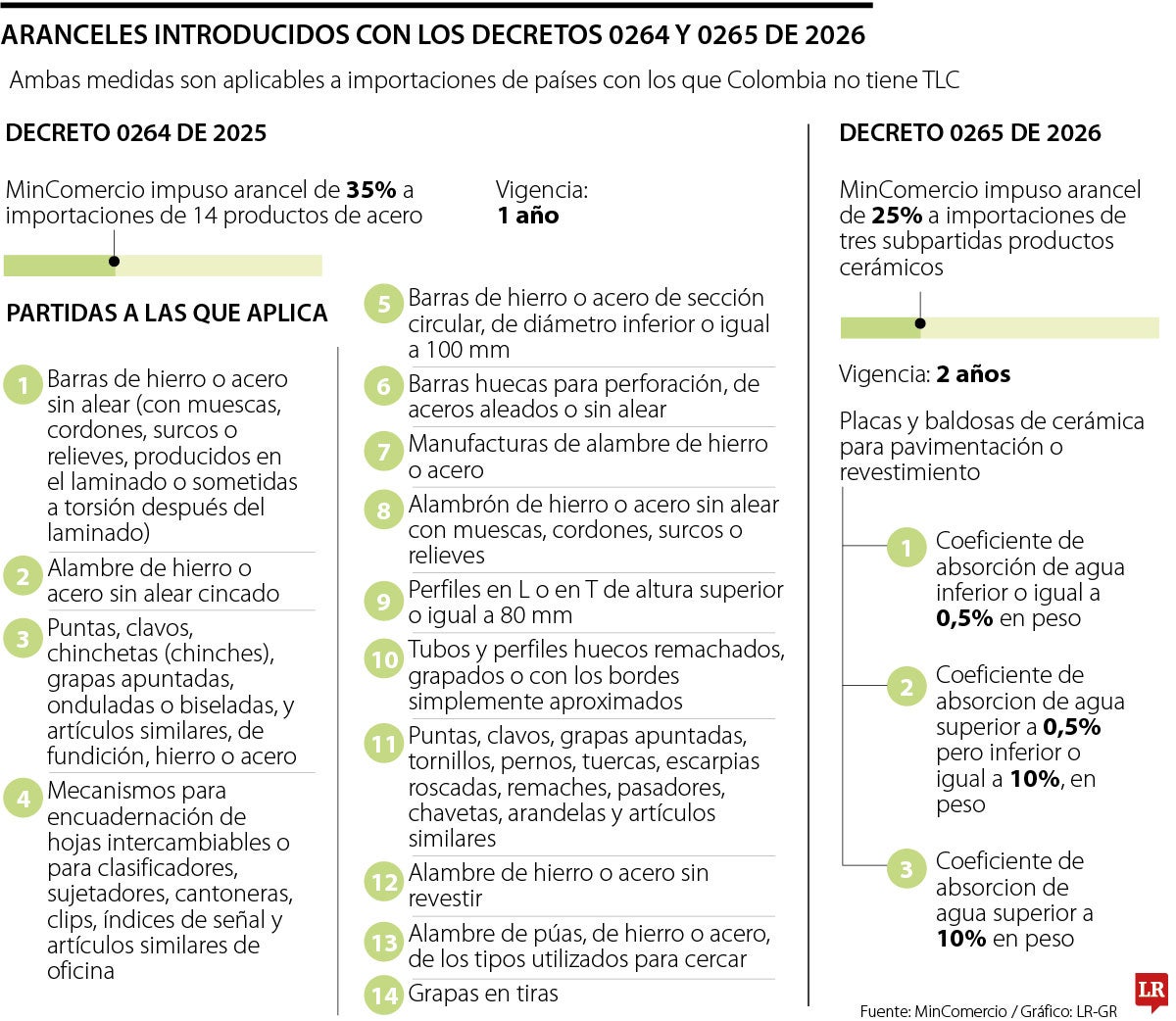 Ante el llamado de las industrias siderúrgica y cerámica por medidas que permitieran a las empresas colombianas competir con productos provenientes de países como China, India y Rusia, el Ministerio de Comercio expidió los Decretos 0264 y 0265 de 2026, mediante los cuales impuso nuevos aranceles a las importaciones de 17 subpartidas de productos originarios de países con los que Colombia no tiene Tratado de Libre Comercio, TLC.
