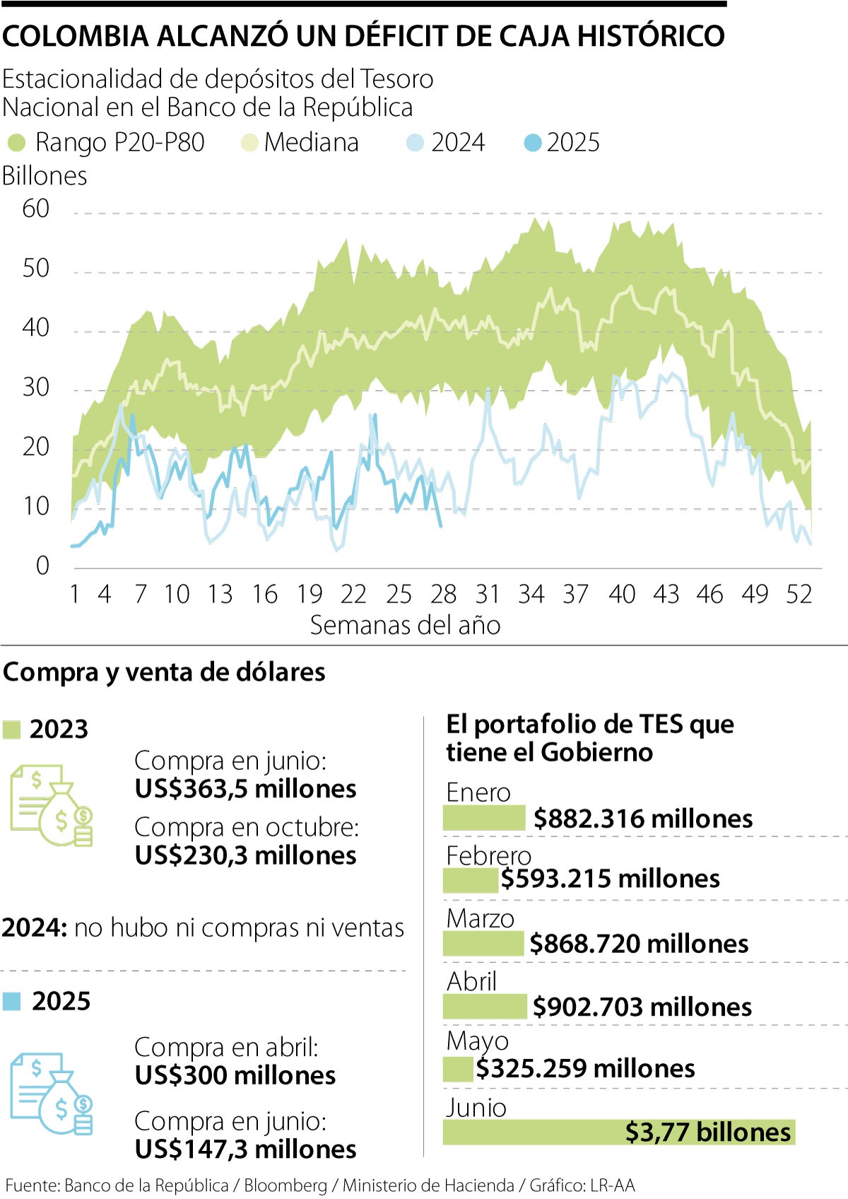 El Gobierno ha desplegado un conjunto de estrategias para solucionar su situación fiscal y también para recuperar la caja, que a finales de junio llegó a mínimos históricos al ubicarse en $6,5 billones. Es decir que tienen apenas cinco meses para cumplir la meta de caja revelada por el director de Crédito Público del Ministerio de Hacienda, Javier Cuéllar, que en la presentación del Marco Fiscal de Mediano Plazo dijo que se buscaba llegar a $20 billones al cierre de 2025.