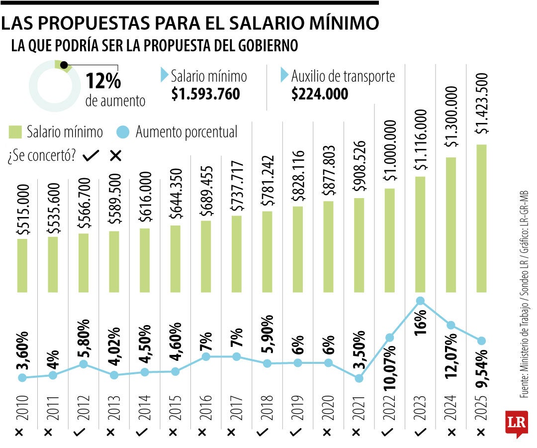 Ayer el ministro del Interior, Armando Benedetti, se refirió sobre ese incremento y aseguró que “es posible que sea un poco más alto de esa predicción que hice hace cuatro semanas (…) No se ha decidido, pero es posible que sea un poco más que ese 11% o 12% debido a que hasta ahora están en las negociaciones”. Y agregó que el decreto se podría conocer la próxima semana.