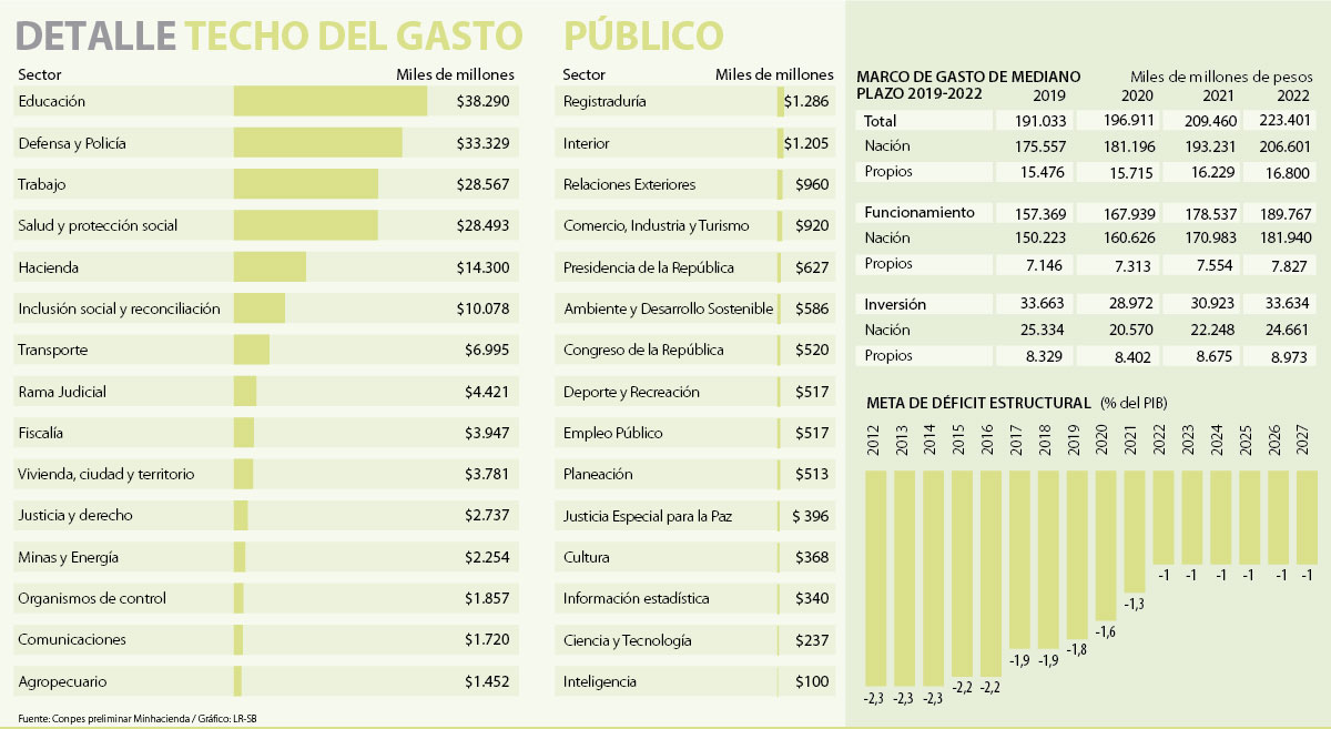 En cuanto a los techos sectoriales para 2019, Educación, Defensa, Trabajo, Salud y Hacienda serían los sectores con mayor gasto con $38,2 billones, $33,3 billones, $28,5 billones, $28,4 billones y $14,3 billones, respectivamente.
