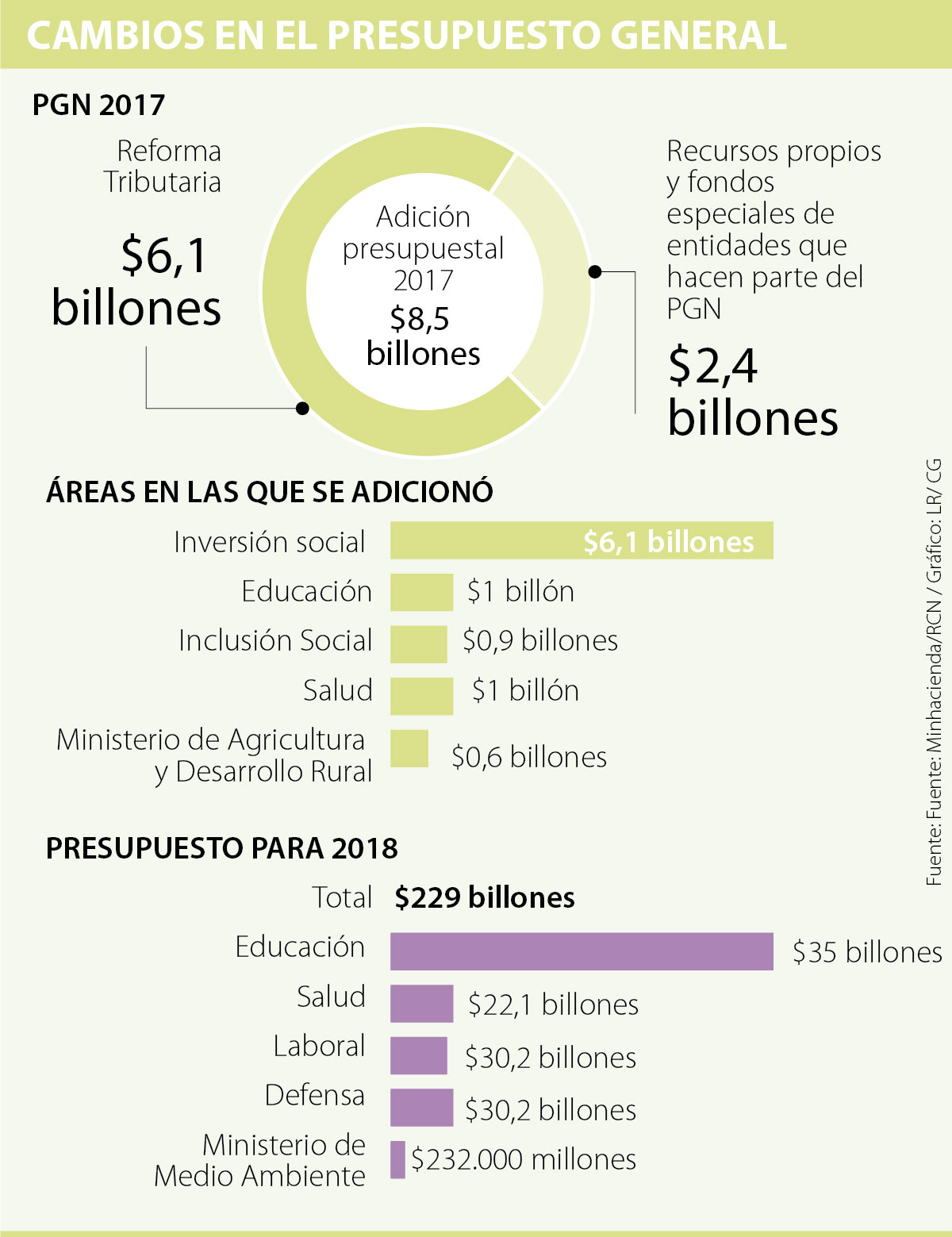 Hace unos meses, el presidente Juan Manuel Santos le dio el último empujón a la Ley 1837, que corresponde a la Adición del Presupuesto General de la Nación para la vigencia 2017. De acuerdo con el documento, esta nueva Ley le brinda un aumento de $8,56 billones. De ellos, $6,1 billones provendrán de la Reforma Tributaria durante este año y $2,4 billones son recursos propios y fondos especiales de entidades que hacen parte del Presupuesto. Los recursos extras fueron destinados al todo el tema social.