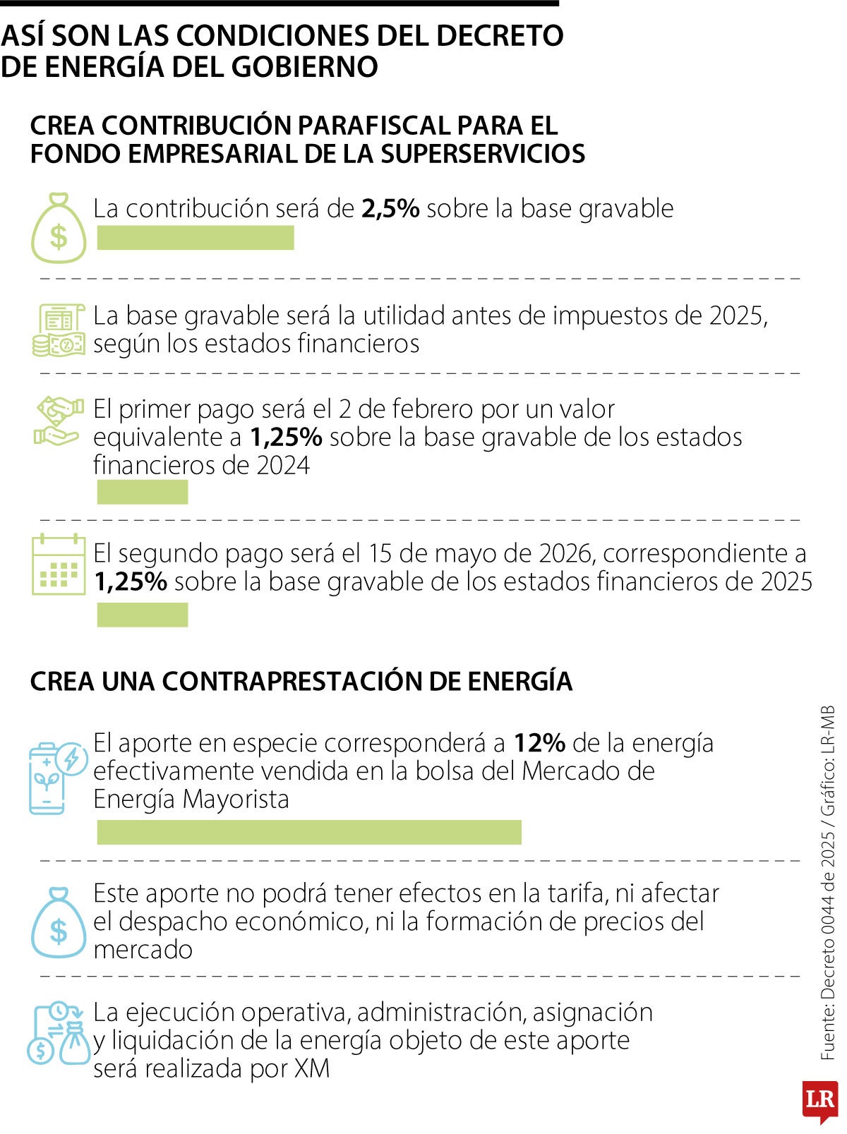 Con esta medida, deberán entregar energía eléctrica para garantizar la continuidad del servicio en las compañías que están intervenidas por la Superintendencia de Servicios Públicos Domiciliarios. El aporte en especie corresponderá a 12% de la energía efectivamente vendida en la bolsa del Mercado de Energía Mayorista y se distribuirá de manera proporcional entre las empresas intervenidas, con liquidación mensual.