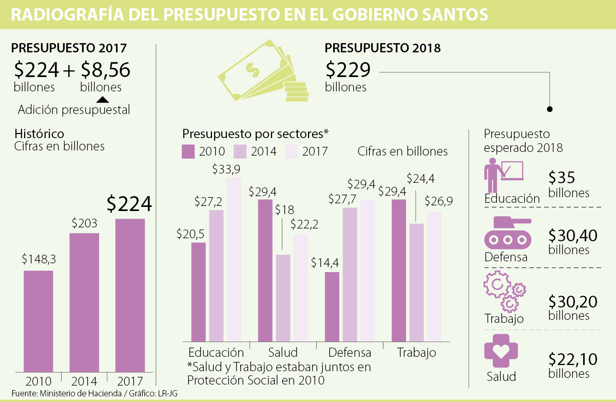 En los dos gobiernos del presidente Juan Manuel Santos el monto del presupuesto ha incrementado $75,7 billones, al pasar de $148 billones a $224 billones entre 2010 y 2017. Esto indica un incremento de 51% en los últimos siete años.