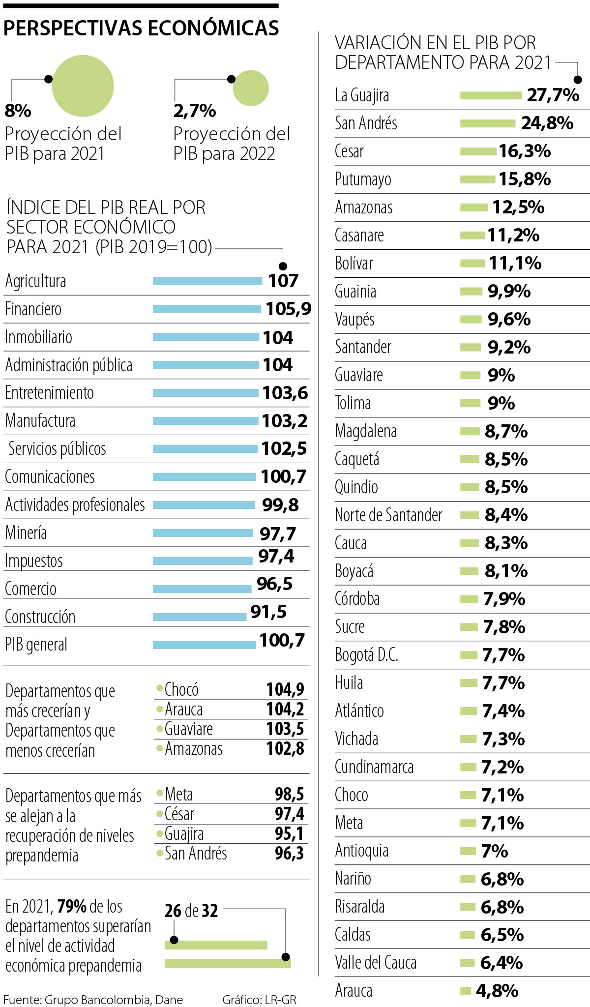 En línea con el último estudio de la dirección de investigaciones económicas, sectoriales y de mercado de Grupo Bancolombia, al final de 2021, 79% de los departamentos del país volverían al nivel prepandemia de actividad económica, lo que se traduce en que 26 del total de los entes territoriales mejorarían las cifras de su PIB este año.