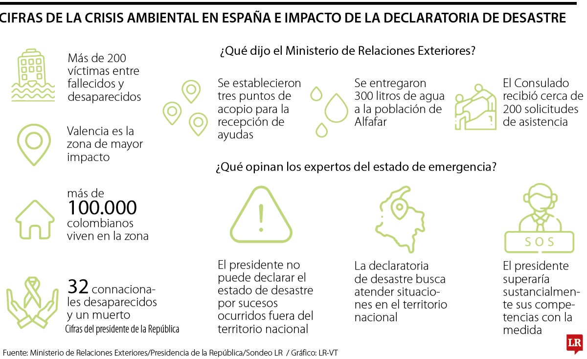 El Ministerio de Relaciones Exteriores manifestó que, a través de su Consulado en Valencia, continuará brindando asistencia a los colombianos que atraviesan dificultades. La cartera afirmó que estableció tres puntos de acopio para la recepción de ayudas y también, entregó 300 litros de agua a la población de Alfafar.