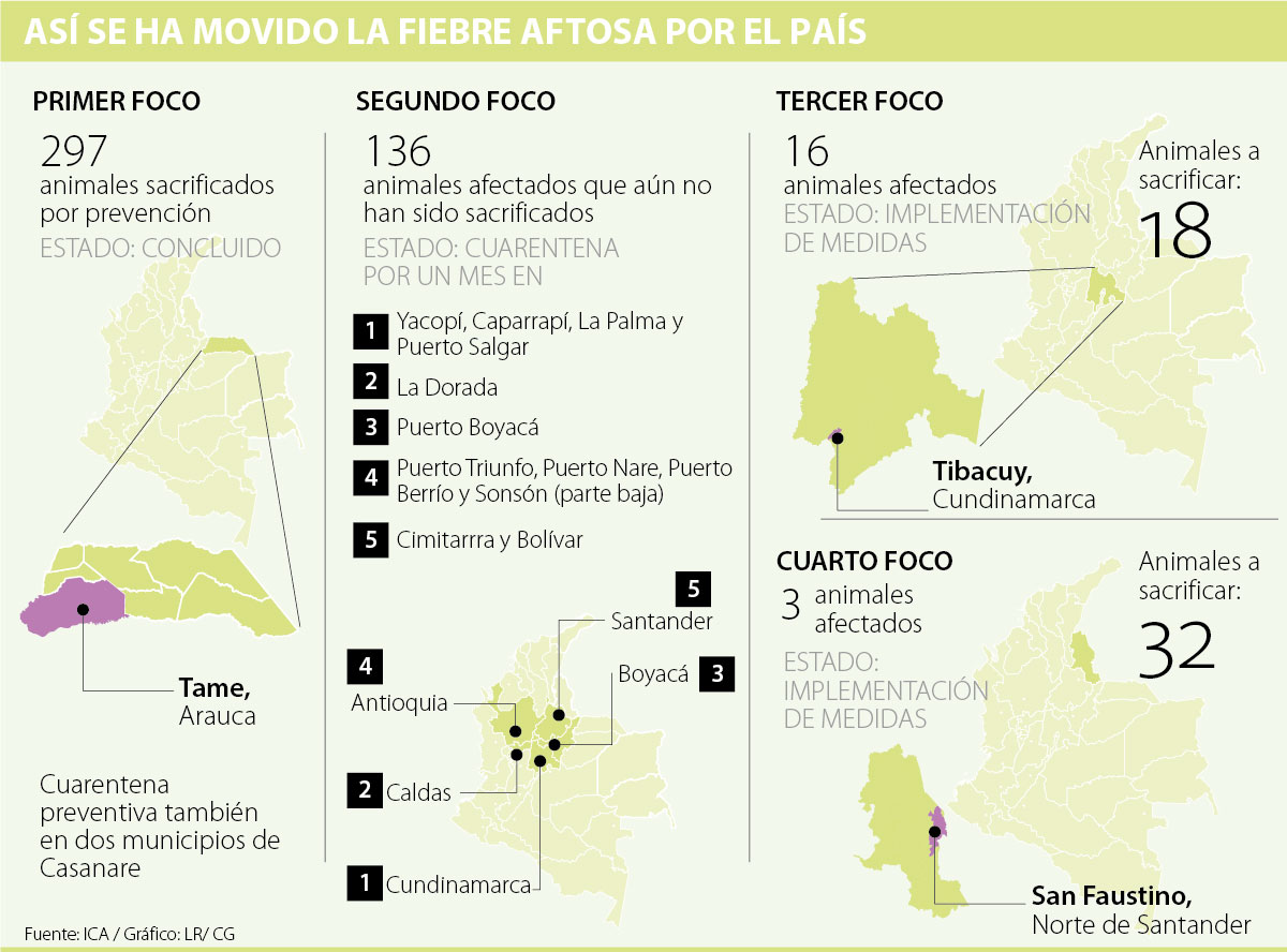 Según el Centro Panamericano de Fiebre Aftosa (Panaftosa), los brotes registrados son de origen venezolano y los animales afectados en los dos municipios de Cundinamarca están relacionados. Desde que iniciaron los controles a la enfermedad los laboratorios del ICA procesan diariamente 850 pruebas de animales para descartar presencia de aftosa.