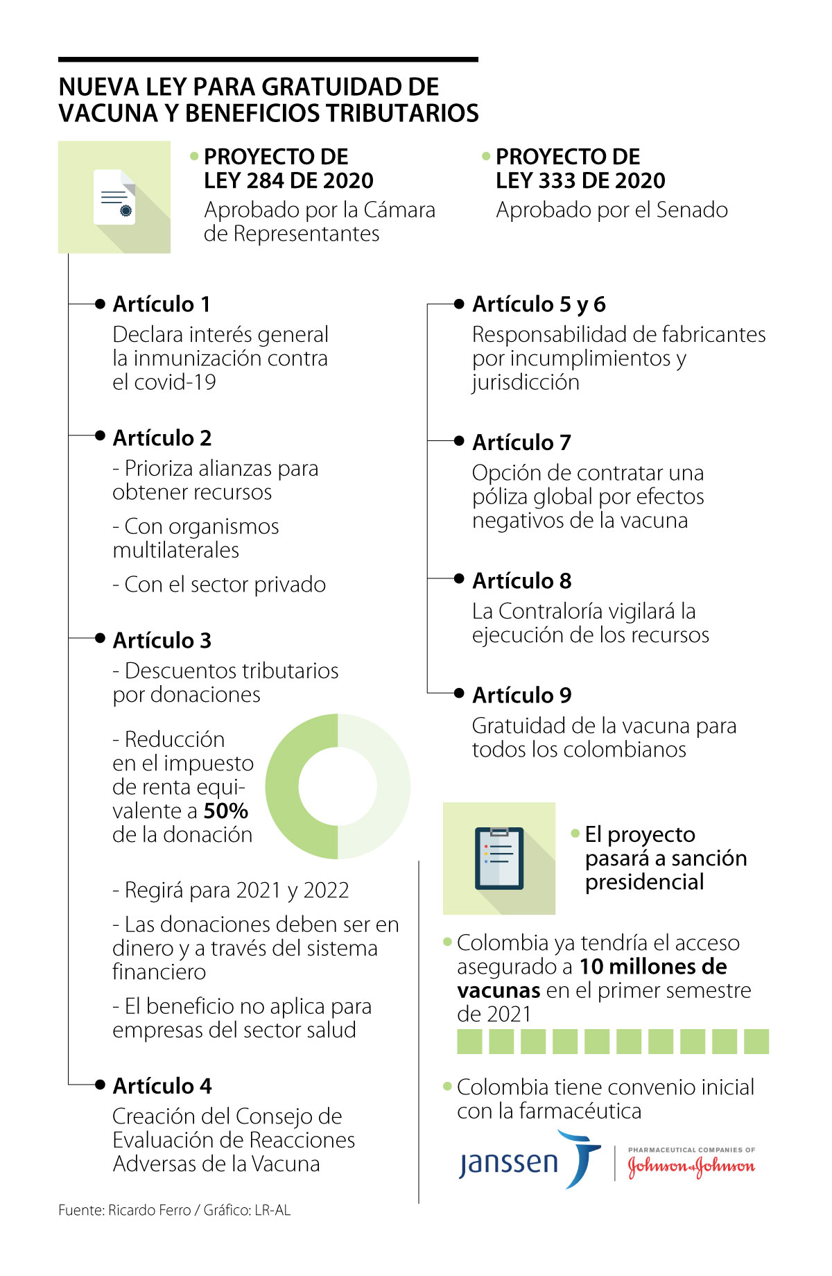 El Congreso de la República aprobó un proyecto de Ley que define beneficios tributarios para las personas y empresas que realicen donaciones públicas que contribuyan al mayor acceso de Colombia a la futura vacuna contra el covid-19, y la posterior inmunización gratuita para todos los colombianos.