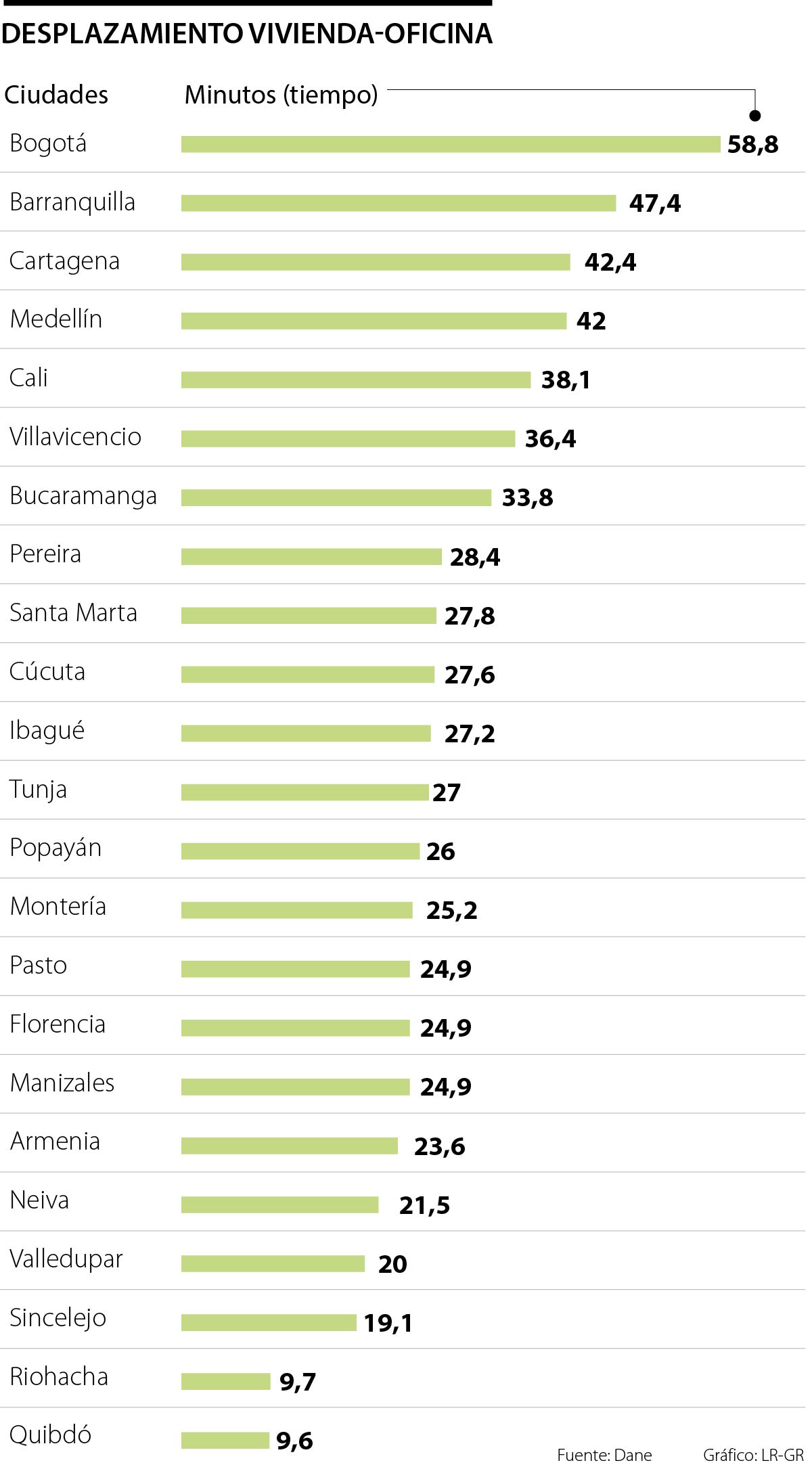 En la orilla contrario, las ciudades con menor tiempo de desplazamiento son Riohacha y Quibdó con 9,7 y 9,6 minutos, respectivamente, a los lugares de trabajo.