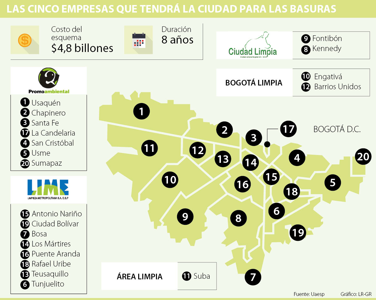 El consorcio que tendrá mayor número de espacios es Lime, que se encargará de ocho localidades; luego viene PromoBogotá, que atenderá el aseo y la limpieza de siete localidades. Ciudad Limpia y Bogotá Limpia tendrán dos cada uno y Área Limpia apenas una (Suba).