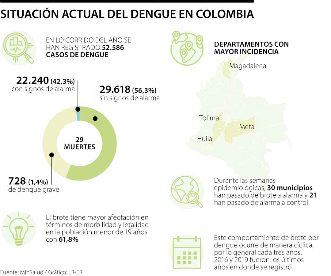 En Colombia se han confirmado 29 muertes, conllevando a una letalidad hasta la fecha inferior a la presentada en años y brotes anteriores. De lo anterior, desde el Ministerio se reitera que es importante la identificación oportuna de los casos con signos de alarma permite el abordaje clínico integral para reducir el riesgo de evolución a formas graves y muertes por esta causa.