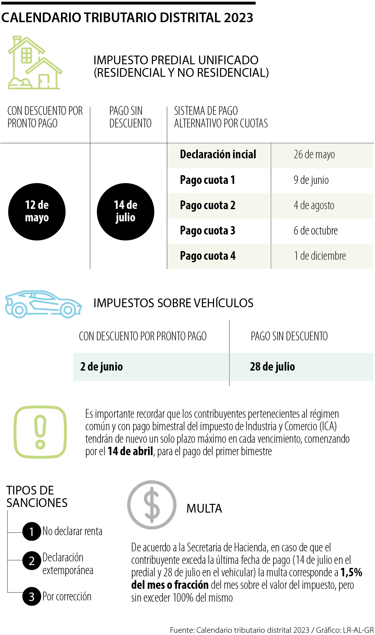 La administración distrital de Bogotá dio a conocer el calendario tributario de 2023, según el cual los contribuyentes tienen plazo para declarar y pagar el impuesto predial sin descuento ni sanción hasta el 14 de julio. El descuento para el predial aplicó hasta el pasado 12 de mayo con un monto de 10%.