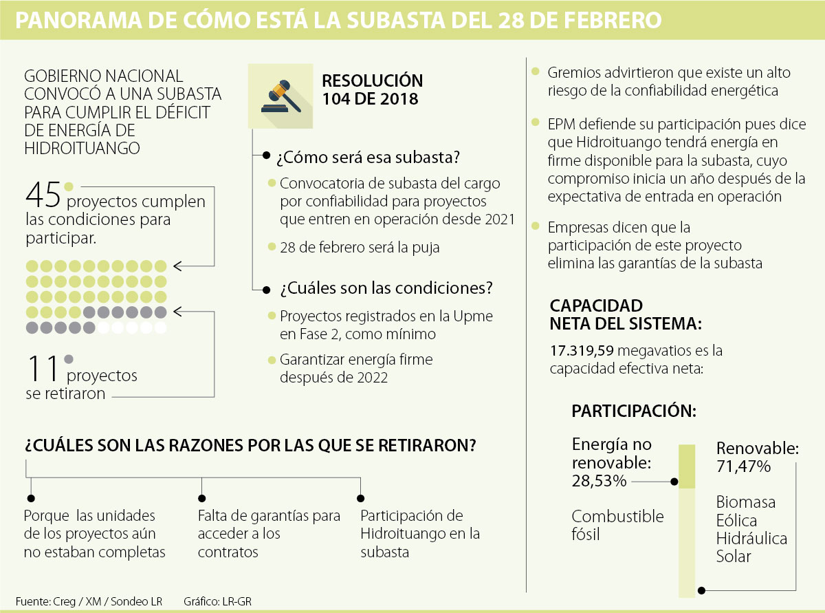 La subasta se llevará a cabo este 28 de febrero. En el proceso se prevé adjudicar una serie de contratos para garantizar la energía firme a partir de 2021 - 2022. O esa es una de las condiciones principales que quedaron consignadas en la resolución 104 de 2018, de la Comisión de Regulación de Energía y Gas (Creg), en la que se estableció que a raíz de la incertidumbre de la entrada en operación de Hidroituango se convocaba a una puja para cumplir ese déficit de energía.