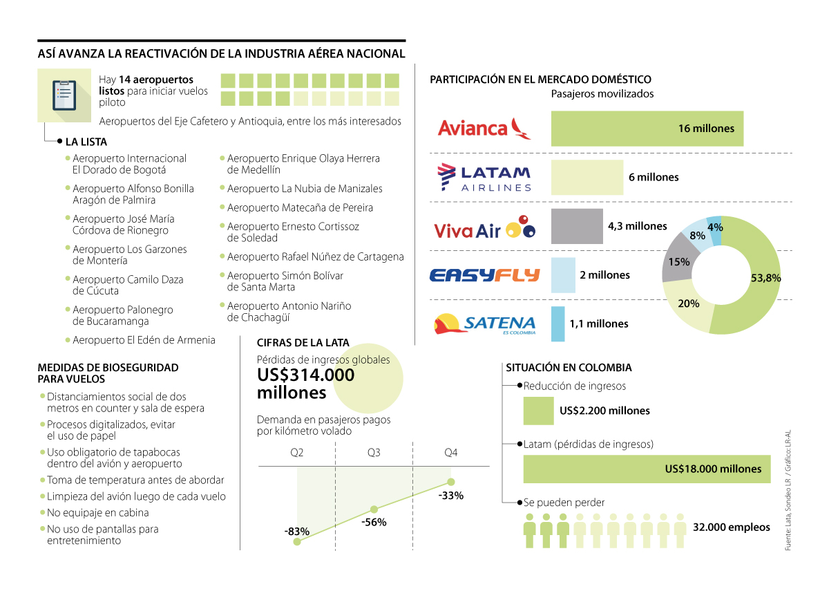 Vale aclarar que en este momento los aeropuertos del Eje Cafetero y Antioquia son los más interesados en reactivar sus operaciones. No solo por la importancia del sector para impulsar sus economías, sino además porque son dos hub estratégicos para industria nacional.
