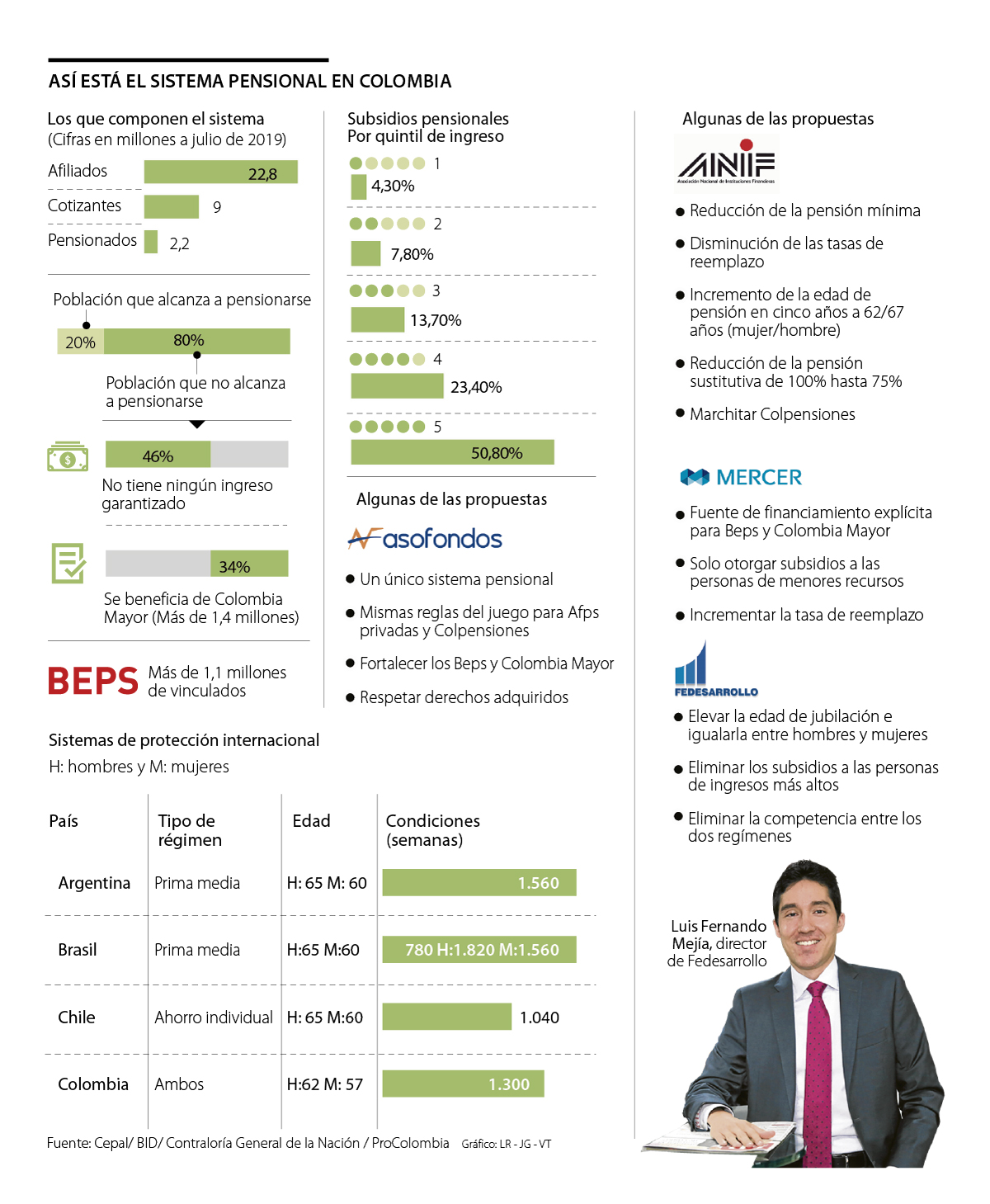 “Si bien el Gobierno ha hablado de que no se va a tocar la edad de pensión, las de Colombia siguen siendo muy bajas frente a países de la región y la Ocde. Se debería aumentar, ojalá a 65 años, puesto que la sociedad ha venido envejeciendo. También se debería igualar entre hombres y mujeres como ocurre y se les debería dar un bono o beneficio a aquellas que tengan hijos para retribuirles por el costo de salir del mercado. Toda la reforma debería ser estructural”, manifestó Mejía, quien también está de acuerdo en eliminar los subsidios a las personas de más altos ingresos o que dicha norma vaya acompañada de otra laboral que reduzca la informalidad.