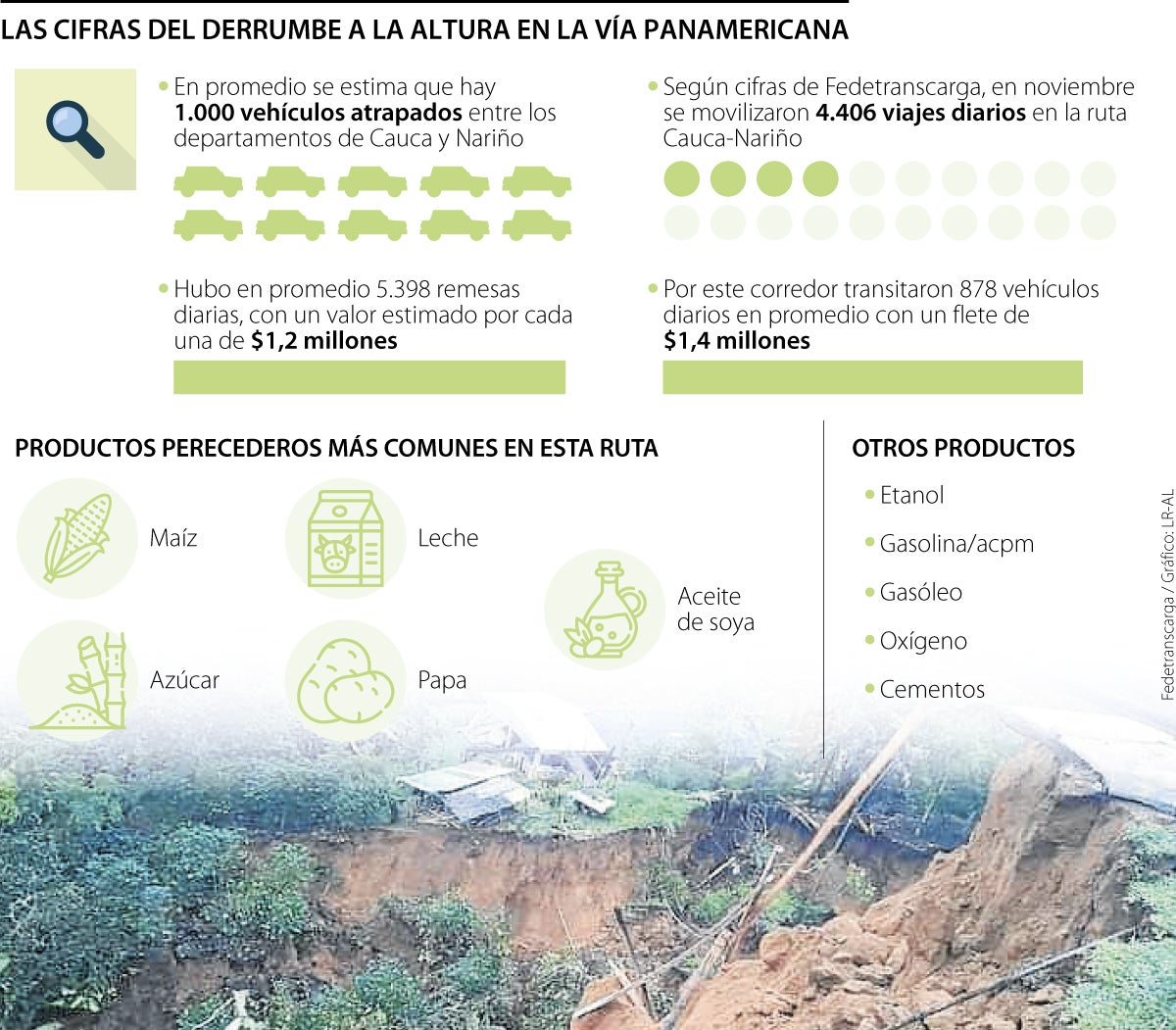 Según estimaciones de la Gobernación de Nariño, hay 1.200 tractomulas atrapadas entre los dos departamentos, ya que por las dos vías alternas solo pueden transitar vehículos pequeños o de carga mediana.