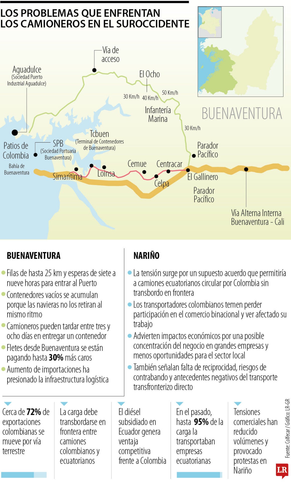 A esta presión en Buenaventura se suma otro foco de tensión en el sur del país, especialmente en Nariño, donde el sector transportador se mantiene en alerta ante la posibilidad de que se permita el ingreso directo de camiones ecuatorianos a territorio colombiano sin necesidad de transbordo en frontera.