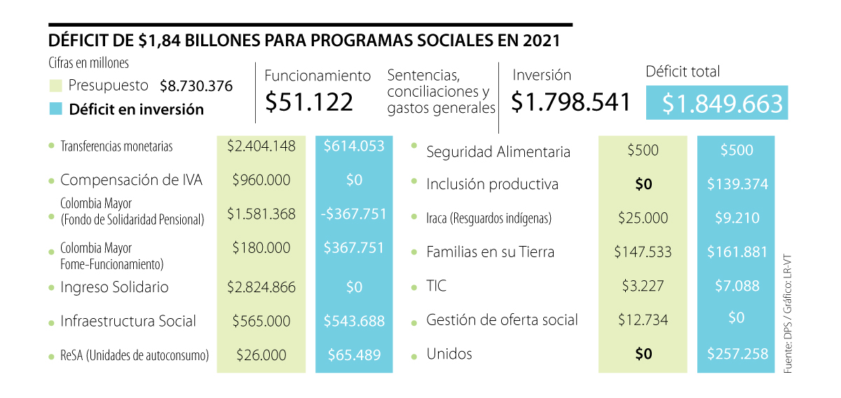 La directora de la entidad, Susana Correa, advirtió ante el Congreso de la República que, para 2021, la necesidad de recursos para los programas de Ingreso Solidario, Jóvenes en Acción (JA), Colombia Mayor (CM), Familias en Acción (FA) y Devolución del IVA, entre otros, aumentará a $10,52 billones, pero el Ministerio de Hacienda planteó un presupuesto de $8,73 billones, es decir, “en el proyecto hay un déficit de $1,83 billones”.