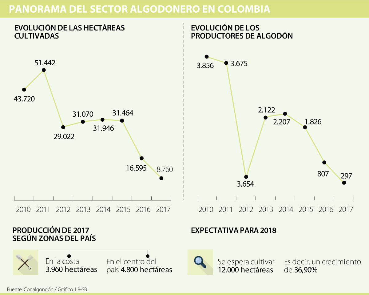 El presidente de la Bolsa Mercantil, Rafael Mejía, resume la situación de los algodoneros de la siguiente forma: “hace cuatro décadas se sembraban cerca de 400.000 hectáreas, ese número bajó a unas 29.000 para 2012, y 2017 cerró con menos de 10.000 hectáreas de algodón”. De hecho, cifras del gremio de los productores revelan que entre 2011 y el año pasado se pasó de 51.442 a 8.760 hectáreas.