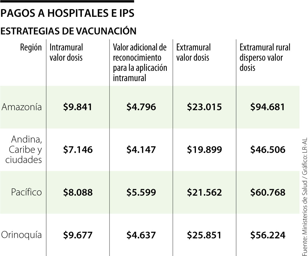 El jefe de cartera explicó que el pago será diferente a cada región, por ejemplo, en la Amazonía la dosis intramural se pagará por $9.841, en las regiones Andina, Caribe y ciudades a $7.146, en el Pacífico a $8.088 y en la Orinoquía a $9.677.