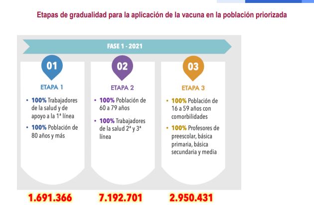 Respecto a la población priorizada en el proceso de vacunación, el jefe de la cartera de salud manifestó que la población ya ha sido identificada en su gran mayoría. La vacunación se priorizará en población de 80 años y más y el talento humano en salud. En la tercera etapa, pero todavía en la primera fase, se considerará la población entre 16 y 59 años con comorbilidades o condiciones que incrementen la probabilidad de un desenlace fatal.