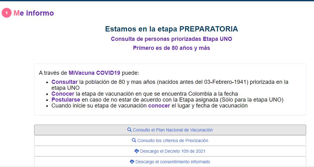 Desde el componente Me Informo, los ciudadanos pueden encontrar lo referente al Plan Nacional de Vacunación contra el covid-19, los criterios de priorización y el consentimiento informado.