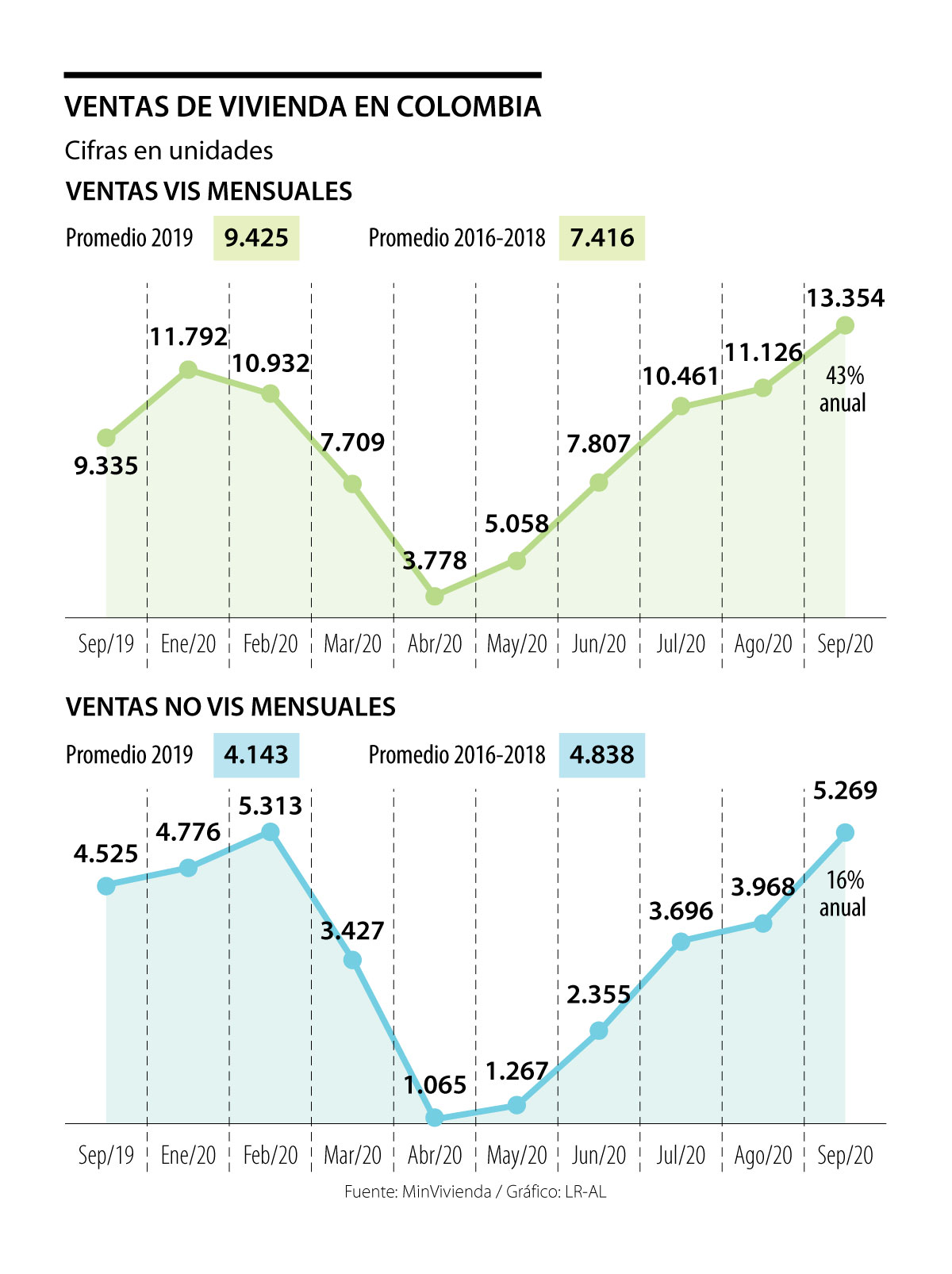 A la espera de que las cifras continúen, en cuanto a las viviendas no VIS, los datos mostraron que, durante septiembre se vendieron cerca de 5.269 unidades, lo cual representó un alza de 16% anual, pues el año pasado se comerciaron 4.525. Pese a que hay mayor impulso para el mercado de interés social, en este segmento también hay subsidios y se prevé que haya una recuperación en adelante.