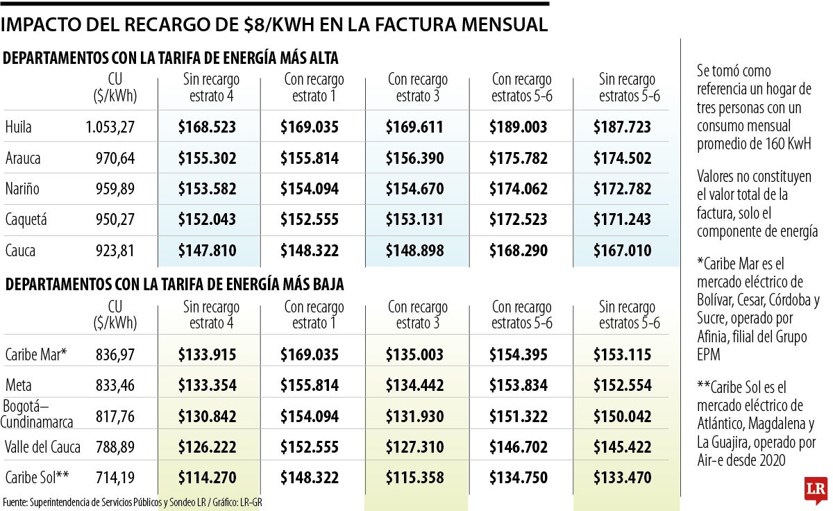 Tomando como base el costo unitario de energía (CU) vigente en cada mercado regional, un consumo promedio de 160 KwH en un hogar de tres personas y tres estratos que asumen subsidios o recargos, se constató que el ajuste trae consigo un aumento fijo de $1.280 al mes. Aunque el recargo es igual en todo el país, las facturas varían según el CU de cada región.
