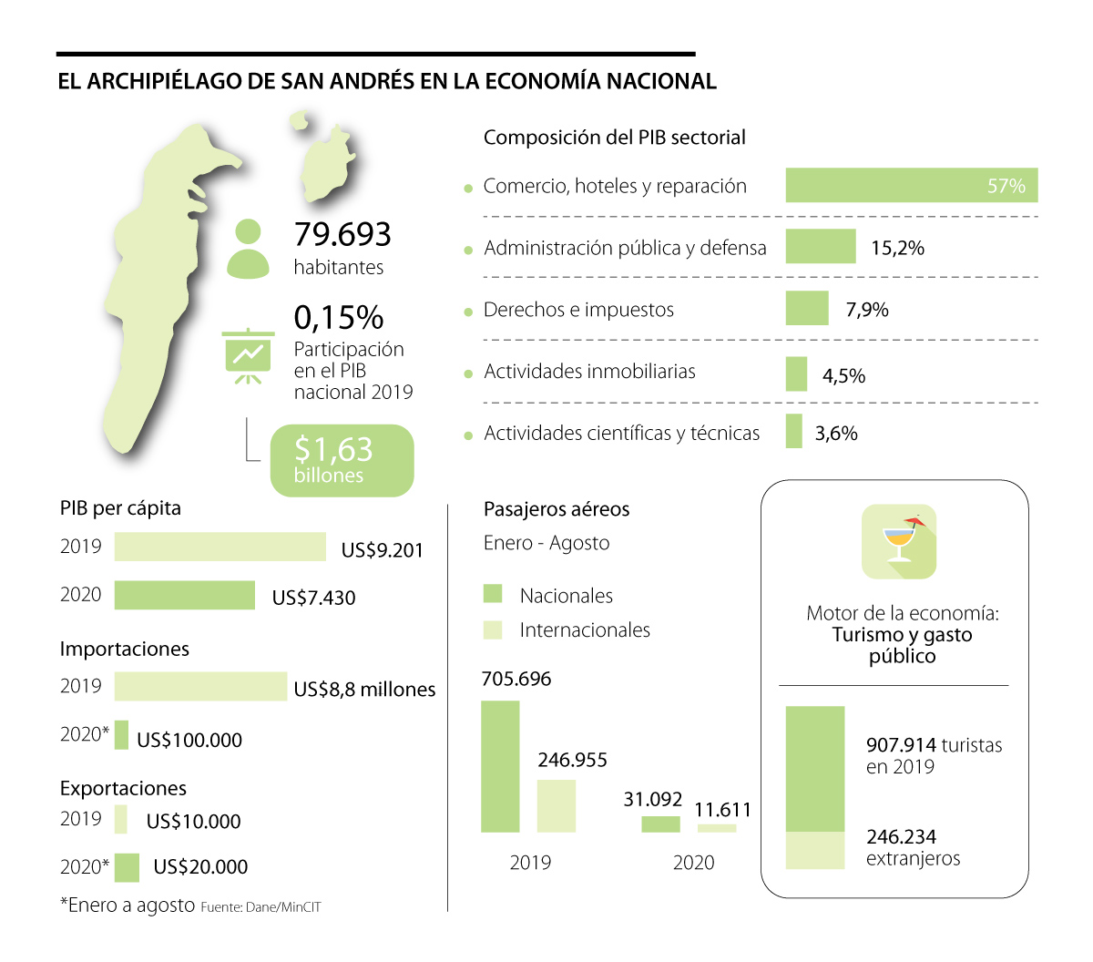 El Producto Interno Bruto de esta zona fue de $1,6 billones en 2019, una cifra que ni siquiera representa 0,2% del PIB total, y que, además, depende en 57% del turismo, un sector que ya esta afectado, pero que terminó de frenar Iota, por lo que puso en jaque más de la mitad de la economía, y el desempleo, que es superior a 16%.