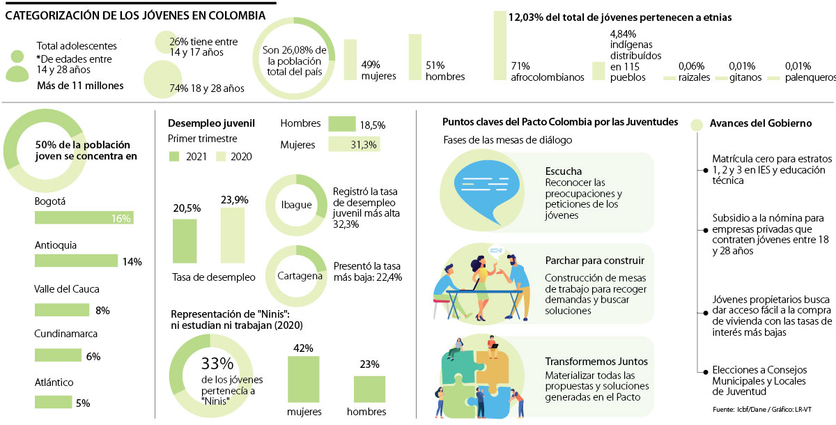 Una de ellas es el ‘Pacto Colombia con las Juventudes, una iniciativa liderada por varias entidades del Gobierno, entre ellas, el Instituto Colombiano de Bienestar Familiar (Icbf) y la Consejería para la Juventud. La estrategia busca abrir espacios de diálogo con los jóvenes de todo el país, algunos de ellos protagonistas de las manifestaciones, para recoger sus preocupaciones y encontrar soluciones conjuntas para atenderlas.