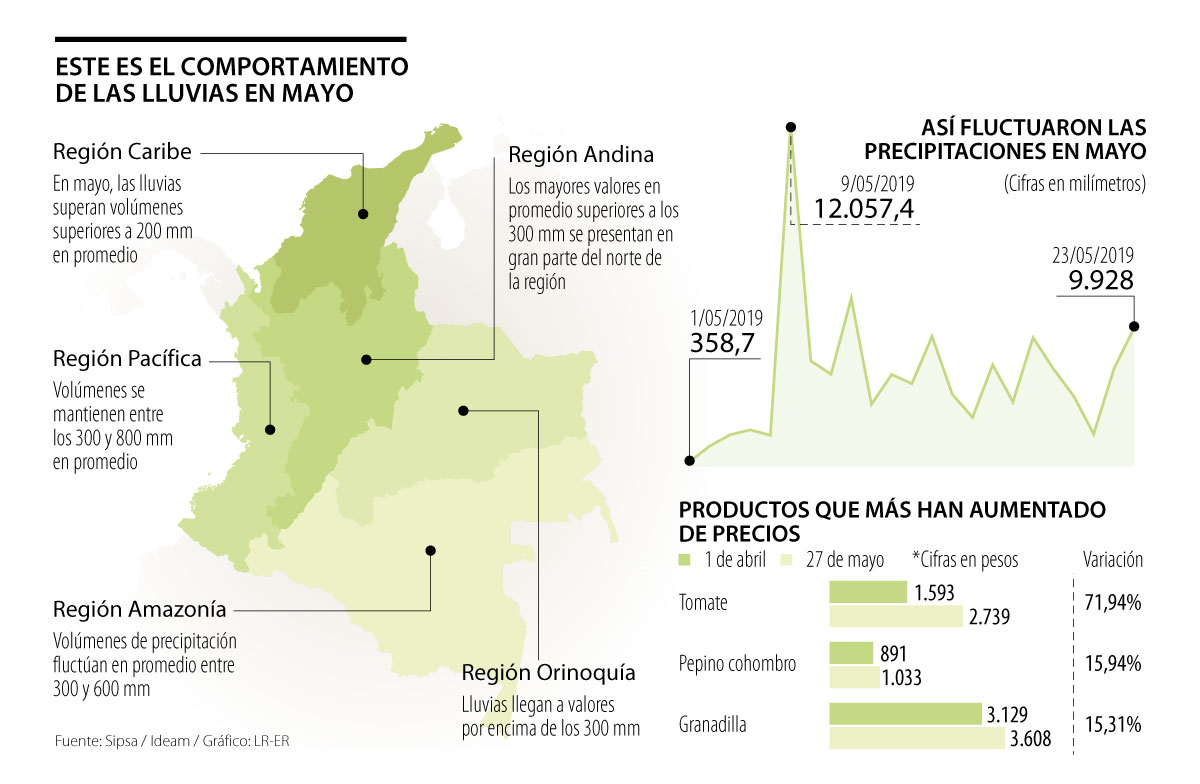 Las torrenciales lluvias también han provocado que los precios de algunas frutas y hortalizas aumenten en algunas centrales de abastos. Por ejemplo, el Sipsa reportó que afectaron la recolección de la arveja verde en vaina en Córdoba, Ipiales (Nariño) o Bogotá. “Está llegando con un grado de humedad que supera 50% por lo que si no se desgrana de inmediato se deteriora. Esta situación genera inestabilidad porque un día el precio baja, al otro sube. También afecta a la habichuela, la coliflor, la lechuga o el cilantro”, explicó Luis Fernando Ríos, vocero de Corabastos.