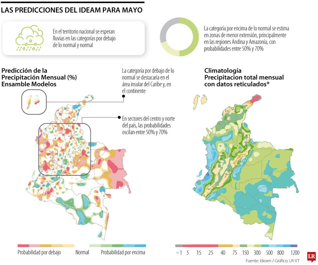 El Ideam reveló en su más reciente Boletín de predicción climática y recomendación sectorial que para mayo se esperan precipitaciones por debajo de lo normal en algunas regiones, especialmente en el Caribe y en sectores del centro y norte del territorio, con probabilidades entre 50% y 70%.