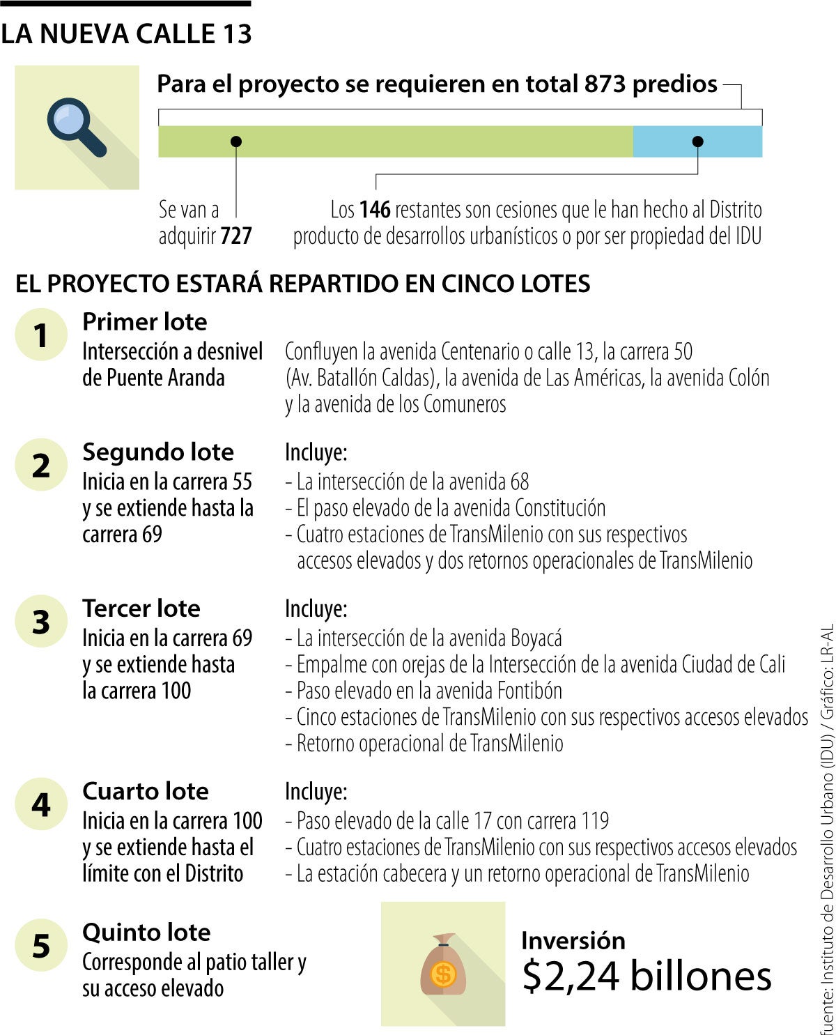 El proyecto estará repartido en cinco lotes. El primero de ellos corresponde a la Intersección a desnivel de Puente Aranda, en la que confluyen la avenida Centenario o calle 13, la carrera 50 (Av. Batallón Caldas), la avenida de Las Américas, la avenida Colón y la avenida de los Comuneros; el segundo inicia en la carrera 55 y se extiende hasta la carrera 69, incluye la intersección de la avenida 68, el paso elevado de la avenida Constitución, cuatro estaciones de TransMilenio con sus respectivos accesos elevados y dos retornos operacionales de TransMilenio.