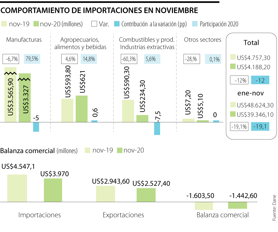 El Departamento Administrativo Nacional de Estadística (Dane) informó en su reporte mensual que, para noviembre del año pasado, las importaciones ascendieron a US$4.188,2 millones, con lo que presentaron una disminución de 12% frente al mismo mes de 2019. Esto, según explicó la entidad, se explica por el comportamiento del grupo de combustibles, que registró una caída de 60,3% frente al año anterior.