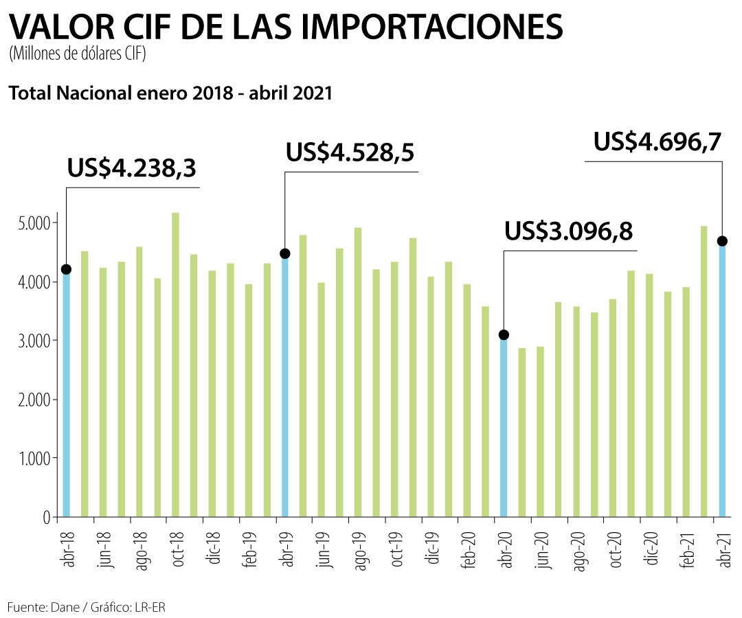 El Departamento Administrativo Nacional de Estadística (Dane), informó que las importaciones registradas ante la Dian en abril de 2021, fueron de US$4.696,7 millones representando un aumento de 51,7% comparado con el mismo mes de 2020. Según la entidad, este comportamiento obedeció principalmente al aumento de 64,2% en la actividad del sector manufacturas.