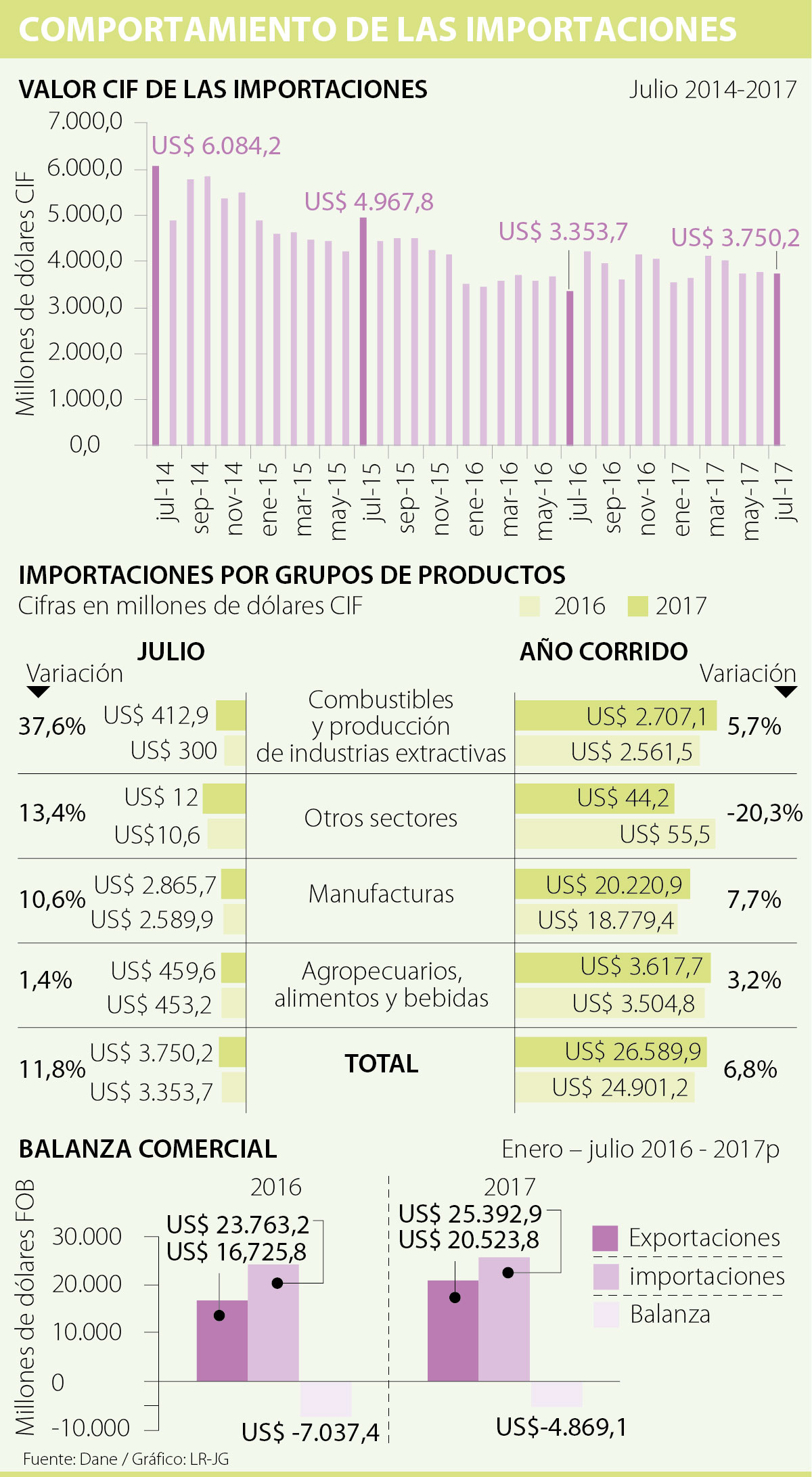 Según el Departamento Administrativo Nacional de Estadística (Dane), las importaciones en julio crecieron 11,8% al pasar de US$3.353,7 millones valor CIF en 2016 a US$3.750,2 millones valor CIF este año. Un crecimiento que respondió principalmente al incremento reportado en grupos como combustibles y productos de las industrias extractivas, con incremento de 37,6%, y manufacturas con 10,6%.