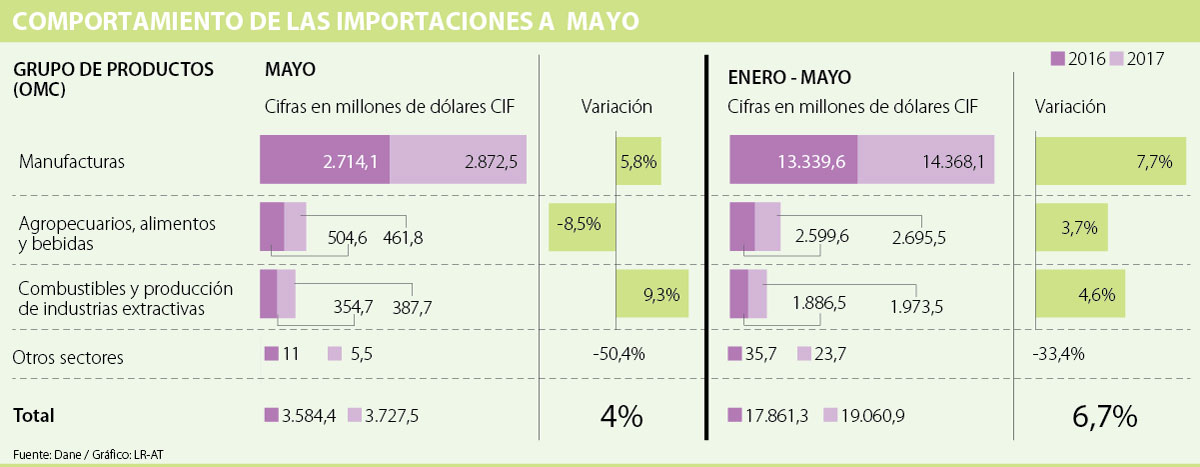 De acuerdo con el Departamento Administrativo Nacional de Estadística (Dane), las importaciones en mayo llegaron a US$3.727,5 millones CIF. Un crecimiento de 4%, respecto a US$3.584,4 millones reportados el mismo mes del año anterior. Y aunque el déficit de la balanza comercial logró el valor más bajo de los últimos 34 meses, llegando a US$186,4 millones FOB, dos grupos de productos sí registraron caídas.