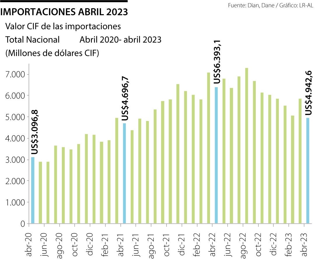 En un nuevo informe, el Dane dio a conocer la cifra de importaciones para el cuarto mes del año y evidenciaron una nueva caída. La entidad señaló que las compras internas llegaron a US$4.942,6 millones, con una caída de 22,7% con relación a abril de 2022.