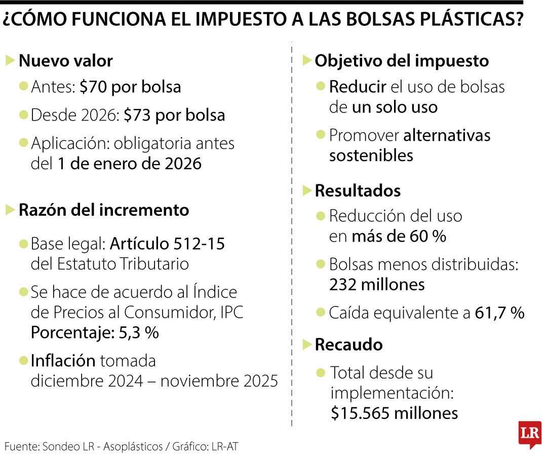 Teniendo en cuenta la Circular 000005 del 16 de diciembre de 2025, este incremento correspondería al costo por bolsa. Es decir, pasaría de $70 a $73. Aunque el aumento no parezca demasiado, este cambio deberá ser implementado en todos los comercios del país antes del 1 de enero de 2026.