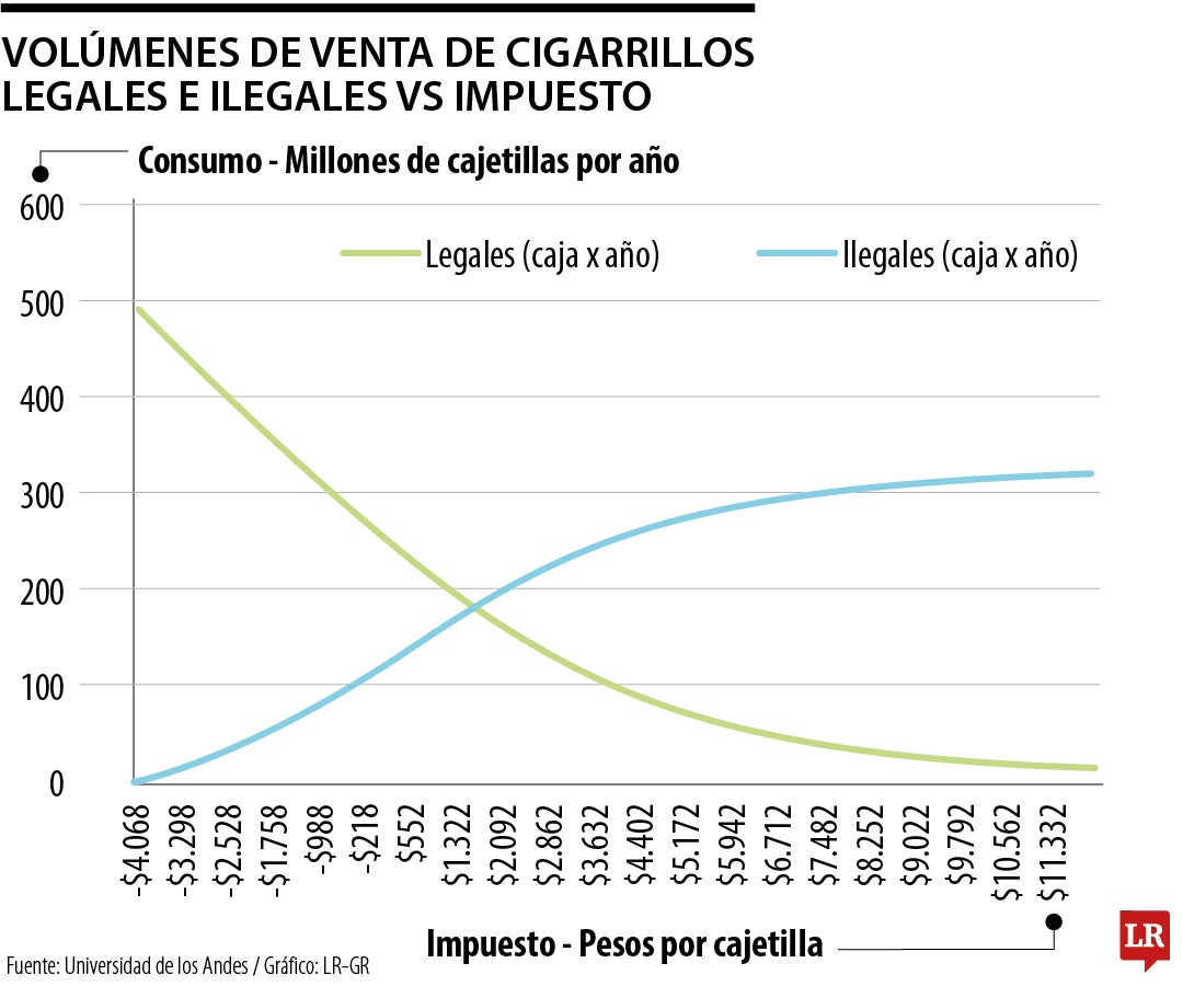 "Más allá de cierto umbral del impuesto específico, el recaudo entra en la parte decreciente de una curva de Laffer: las ventas legales se desploman, el contrabando y la participación de los cigarrillos ilegales en el mercado total aumentan y las rentas de las organizaciones criminales vinculadas al contrabando crecen sustancialmente", según explica el documento.