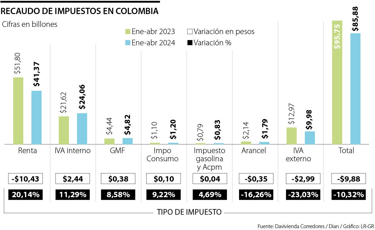 De hecho, solo en abril de 2024, el recaudo por este impuesto fue de $12,3 billones mientras que en el mismo mes de 2023 fue de $25,1 billones.