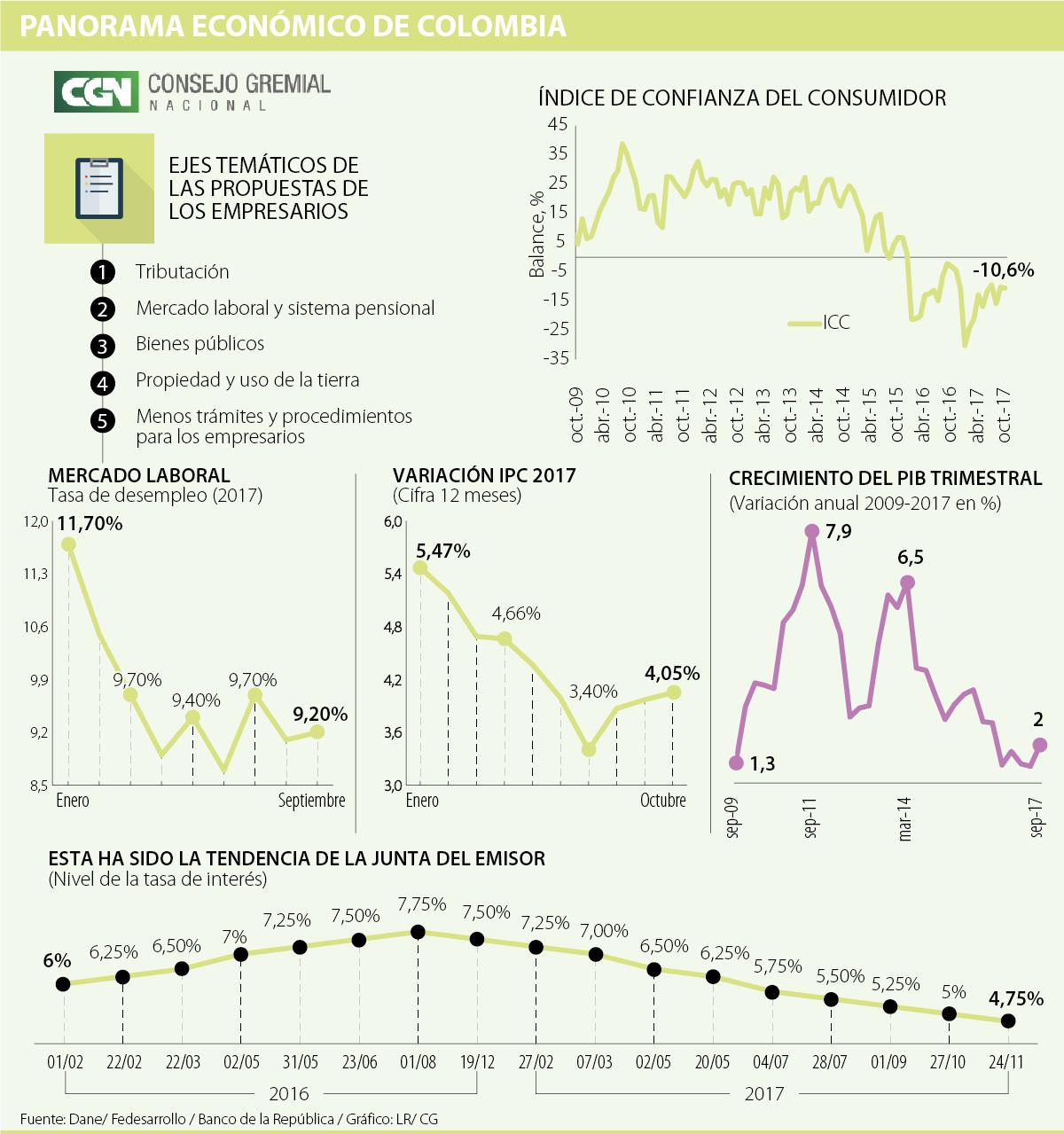 Además, los últimos datos indican que la economía no pasa por su mejor momento. De acuerdo con las cifras del Departamento Administrativo Nacional de Estadística (Dane), la economía no crece por encima de 4%, incluso ha llegado a mínimos de 1,2% de variación en el Producto Interno Bruto (PIB) en el tercer trimestre de 2016 y en el segundo trimestre de 2017.
