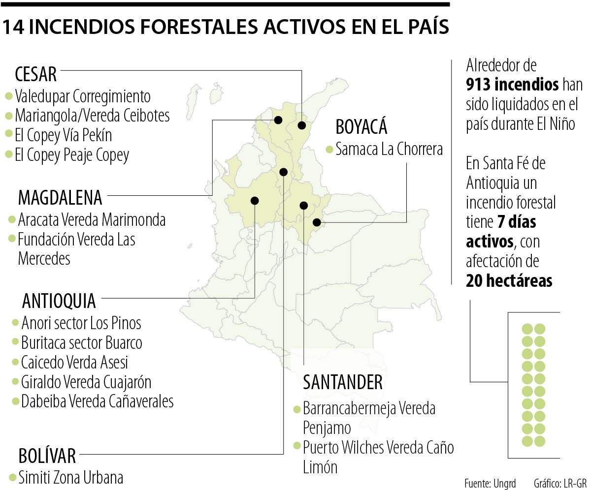 De 14 conflagraciones reportadas en Boyacá, Bolívar, Cesar, Magdalena y Santander, Antioquia es el más afectado con cinco activos