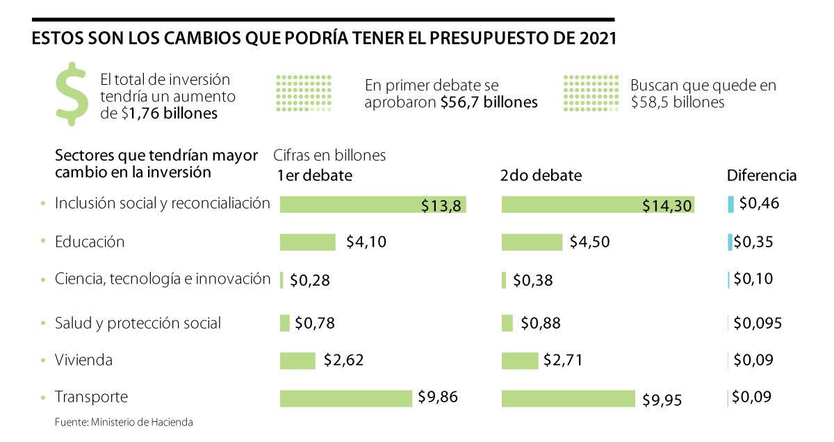 De aprobarse el presupuesto de inversión final ($58,5 billones), inclusión social y educación serían los rubros con mayor adición de esos casi $6 billones que se han venido aumentando. Tendrían una adición de $469.000 millones y $353.000 millones, respectivamente.